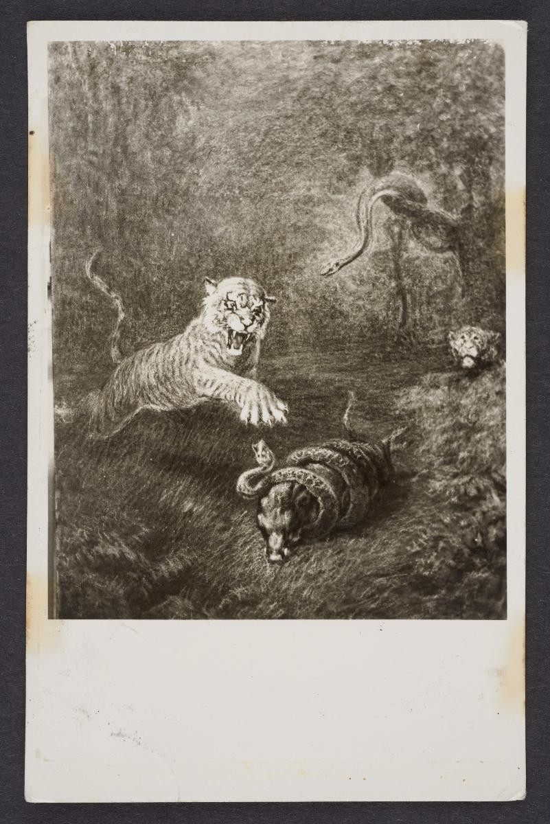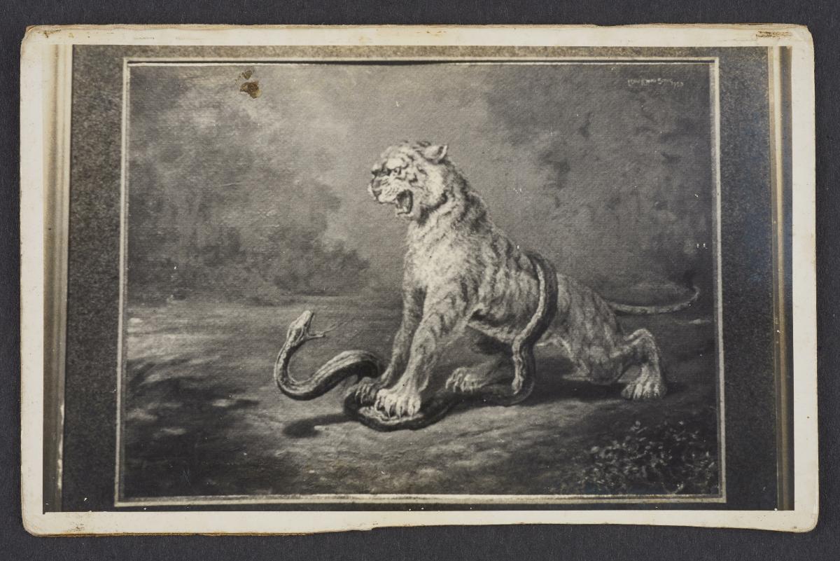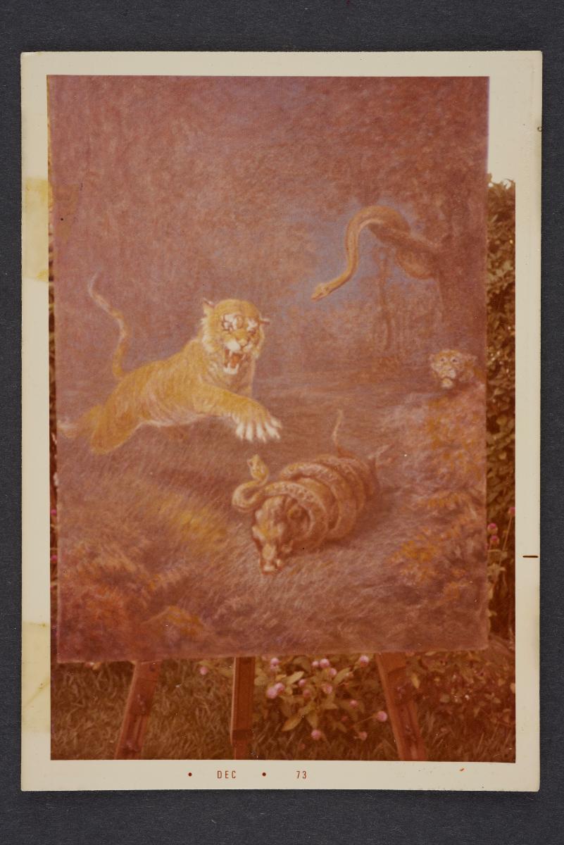 This photograph shows a painting of two tigers. Low Kway Song (1889-1982) was a pioneering artist who painted portraits of many prominent personalities in Singapore and Malaysia. He became the first artist to be paid a four-figure fee when he was commissioned to paint a portrait of the magnate Oei Tiong Ham in 1927. Low Kway Song established the first Straits Chinese Methodist Church in Malacca and in 1940 he became the Pastor of the Malacca Straits Chinese Methodist Church, where services were conducted in Baba Malay. Part of an archive which provides a record and glimpse into his personal life and artistic practice, this came from a collection which belonged to Low Kway Song.