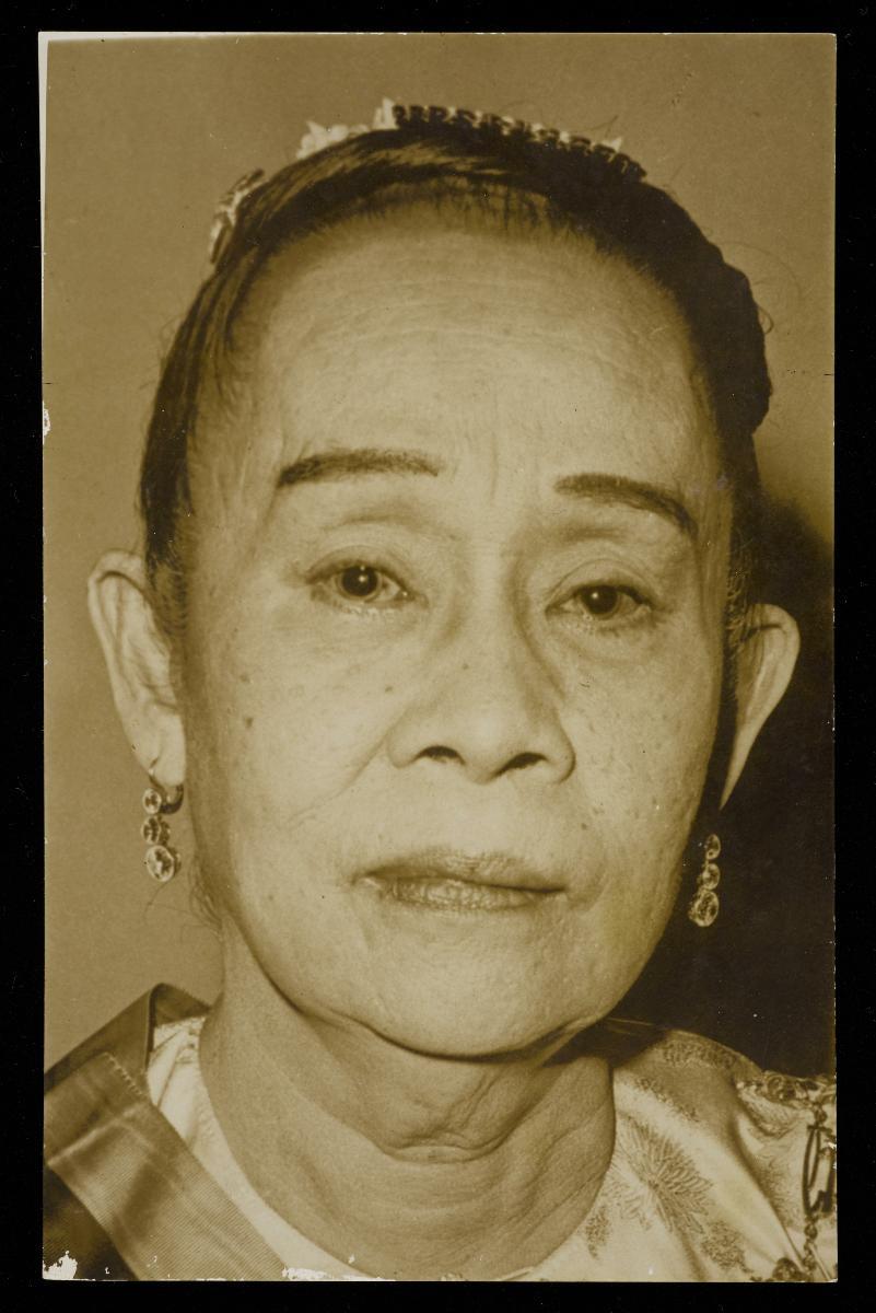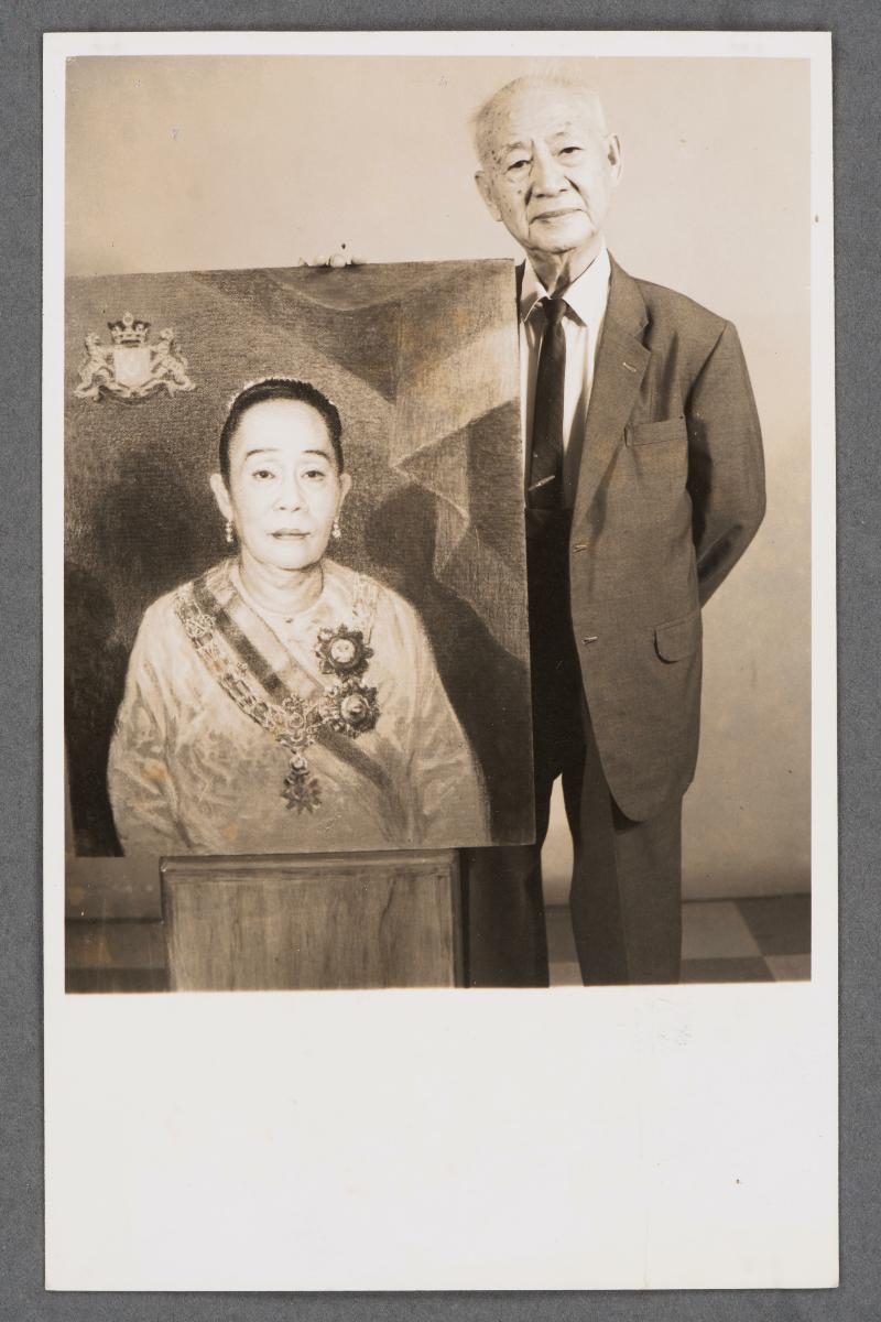 This photograph shows Sultanah Ungku Tun Amina binti Ungku Ahmad. She was married to Sultan Ismail of Johor, and was named Sultanah in 1959, on the Sultan’s 65th birthday. She passed away in 1977. Low Kway Song (1889-1982) was a pioneering artist who painted portraits of many prominent personalities in Singapore and Malaysia. He became the first artist to be paid a four-figure fee when he was commissioned to paint a portrait of the magnate Oei Tiong Ham in 1927. Low Kway Song established the first Straits Chinese Methodist Church in Malacca and in 1940 he became the Pastor of the Malacca Straits Chinese Methodist Church, where services were conducted in Baba Malay. Part of an archive which provides a record and glimpse into his personal life and artistic practice, this came from a collection which belonged to Low Kway Song.