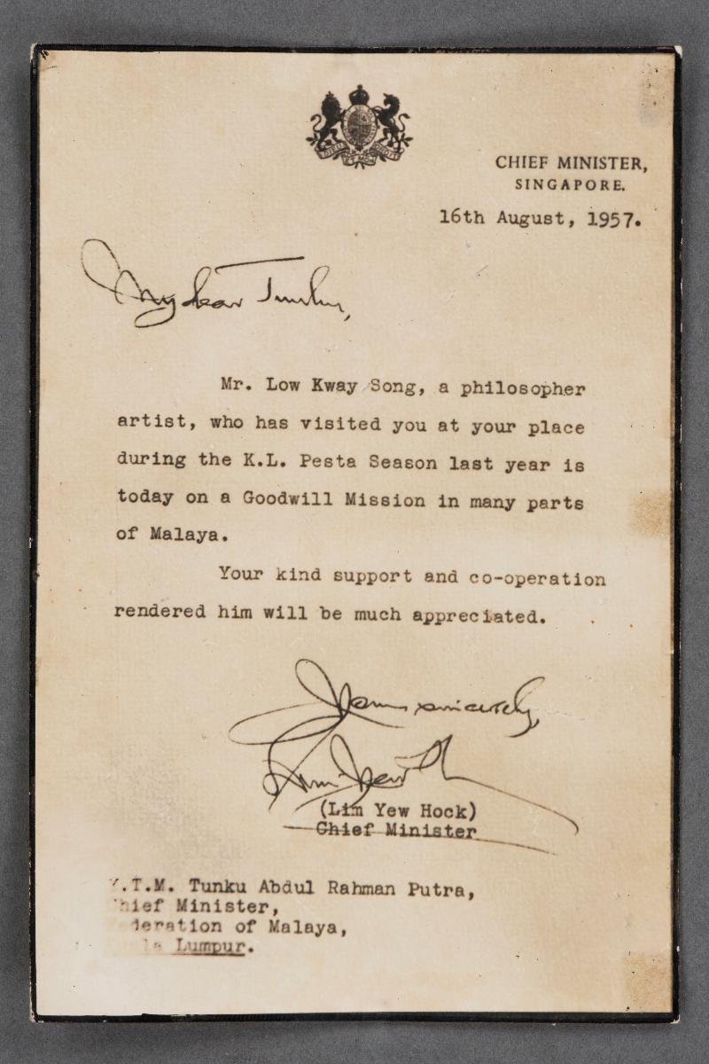 This letter was addressed to Low Kway Song from Abdul Aziz Bin Indris, Private Secretary of the Sultan of Kelantan. Low Kway Song (1889-1982) was a pioneering artist who painted portraits of many prominent personalities in Singapore and Malaysia. He became the first artist to be paid a four-figure fee when he was commissioned to paint a portrait of the magnate Oei Tiong Ham in 1927. Low Kway Song established the first Straits Chinese Methodist Church in Malacca and in 1940 he became the Pastor of the Malacca Straits Chinese Methodist Church, where services were conducted in Baba Malay. Part of an archive which provides a record and glimpse into his personal life and artistic practice, this came from a collection which belonged to Low Kway Song.