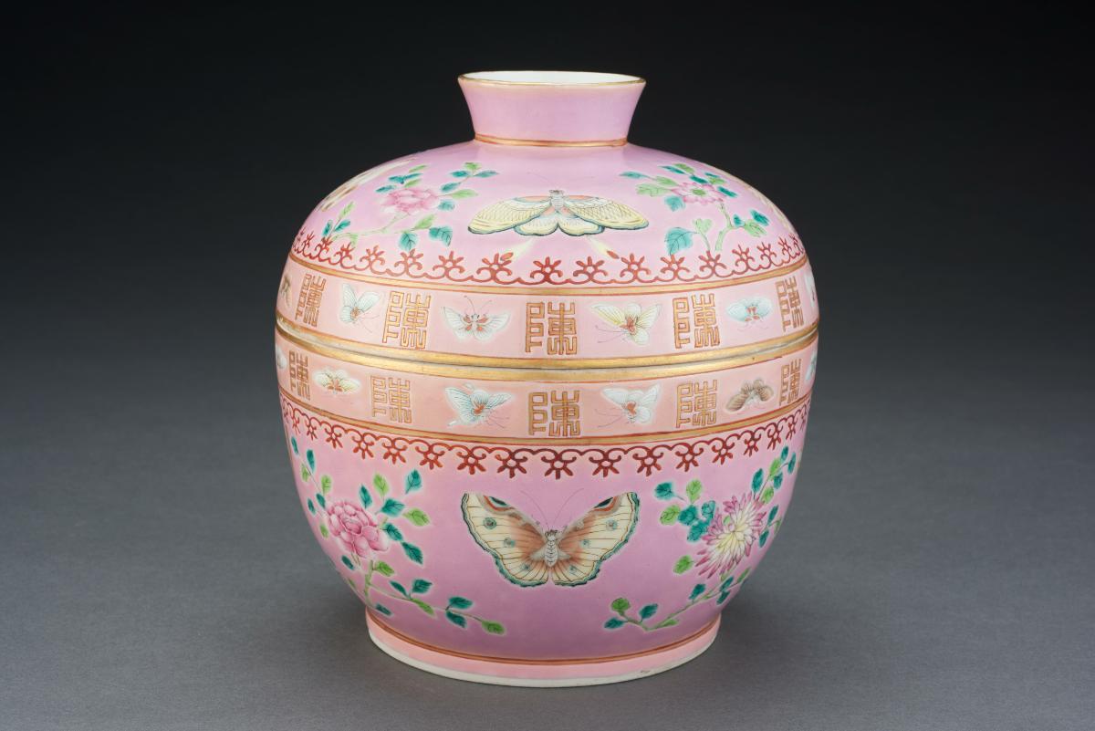This pink chupu with yellow panels is decorated with floral motifs. Pink peonies decorate the yellow panels and flowers decorate the pink ground. Yellow decorative bands with the eight buddhist emblems were around the rim of the chupu and lotus petal bands around the base. The top of the cover bears the seal of “Xu” (许) and the base bears the shopmark of “Jing Zhen Xu Shun Chang Zao” (景镇许顺昌造).The word ‘chupu’, as known as ‘cepu’ in Malay, was used by Peranakan Chinese to refer to covered jars. The chupu comes in various sizes and in a range of enamel colour schemes. It was used for ceremonial occassions to serve special food such as bird’s nest soup. Peranakan porcelain, or nyonyaware, are terms used to refer to a type of overglazed, polychrome, enamelled porcelain made in China (probably Jingdezhen) specifically to suit the taste of Peranakan Chinese communities in insular Southeast Asia (Singapore, Malaysia and Indonesia).