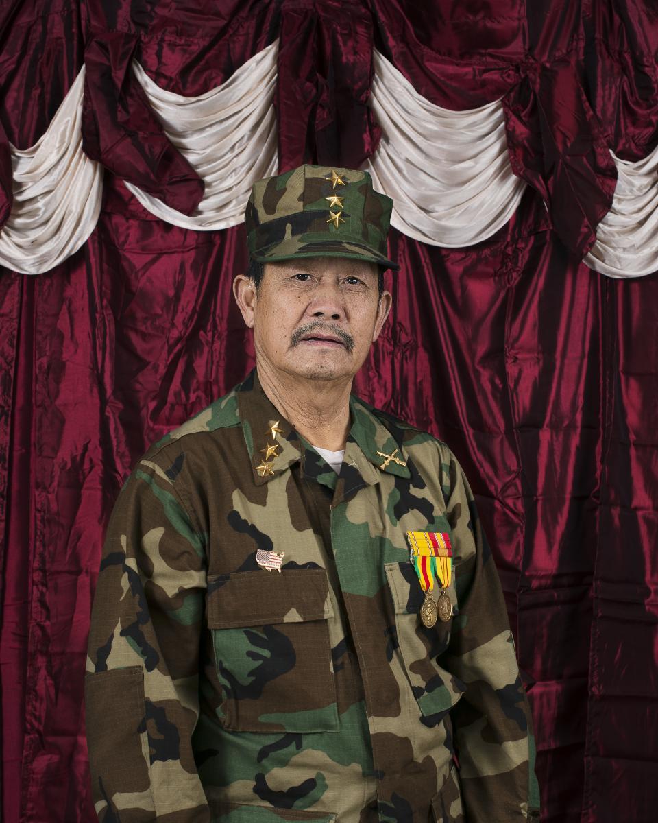“How does a group of dedicated, patriotic Vietnam War veterans, get cast aside? Why is it so important for these men to be recognized by the US military? How does a group of men get erased from the Vietnam War history? What drives a person to want recognition so much that they have to insert themselves into its history?” Motivated by these enquiries, Laotian-American artist, Pao Houa Her reached out to these ex-soldiers and over a period of three years, captured these Hmong-American veterans using tropes from 19th century General paintings, Civil War soldier portraits and official presidential portraits against the backdrop of a collapsible photography studio. The makeshift impression of the collapsible studio becomes evident after closer study of the portraits; there are inconsistencies in the framing of the sitters; the tasselled fringe of a curtain backdrop curves or cuts out of the frame in odd angles; the two-toned hem of another curtain backdrop is left un-cropped from the photo. These peculiarities would sit incongruous within ‘official’, stately portrait photography except these models do not seem to portray characteristics of stateliness. With ill-fitting uniforms and inconsistencies in the arrangement of their attire, these portraits could appear amateur, however they are anything but. Pao Houa Her’s sensitivity toward each individual is noteworthy. She manages to honestly capture the raw and crude quality of these veterans who, though ordinary and unremarkable in appearance, carry within them the weight of a history of unacknowledged or untold.