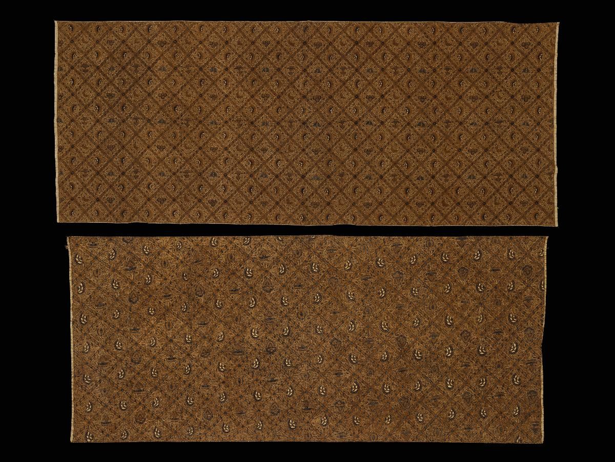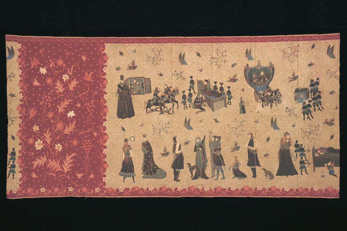 This red-and-blue skirt cloth, also known as kain panjang, is decorated with repeated scenes of two swans landing peacefully on a calm pond interspersd with long stems of flowering plants. This skirt cloth would have been worn with an open jacket with V-shaped lapels known as the kebaya.