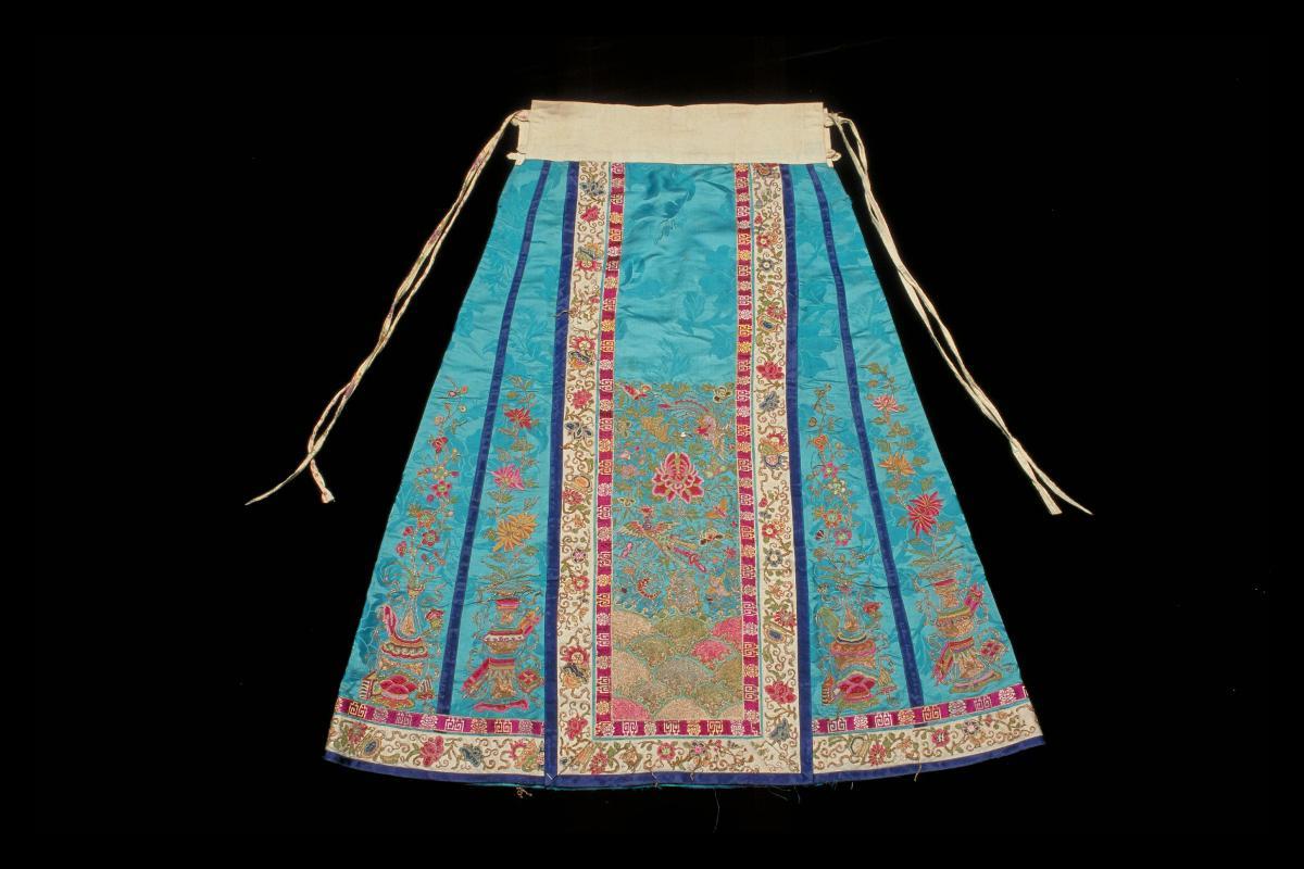 This is a set of wedding garment and skirt. The orange blouse has a mandarin collar and side opening and is worn together with a silk skirt. Both the blouse and skirt are embroidered with peonies. Sequins and metallic thread are used to decorate the sleeves and borders of the garment and skirt. Peranakan Chinese wore Chinese-style clothing particularly during festive occasions like weddings as a reflection of their Chinese heritage.