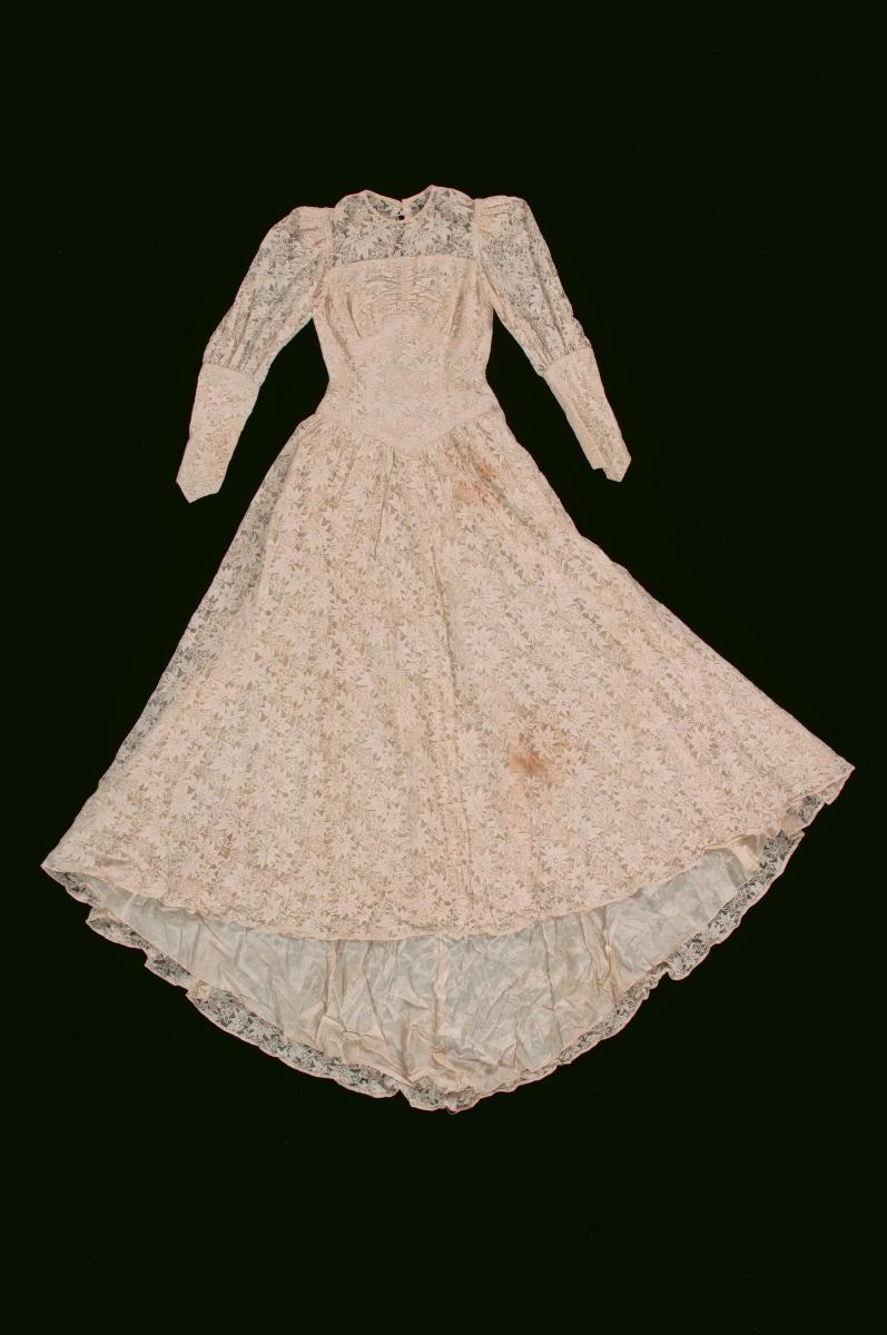 This wedding robe is embroidered with auspicious motifs in gold and silk thread including five-clawed dragons amidst stylised clouds, with waves and mountains at the hem. The wedding robe is worn together with a silk skirt. This wedding ensemble belonged to a Peranakan family from Malacca.Taken together, the two-piece ensemble was known as aoqun, a popular form of Han Chinese dress during the Qing dynasty. The sides of the skirt are finely pleated. Chinese auspicious motifs such as phoenixes and dragons are used to decorate the skirt.