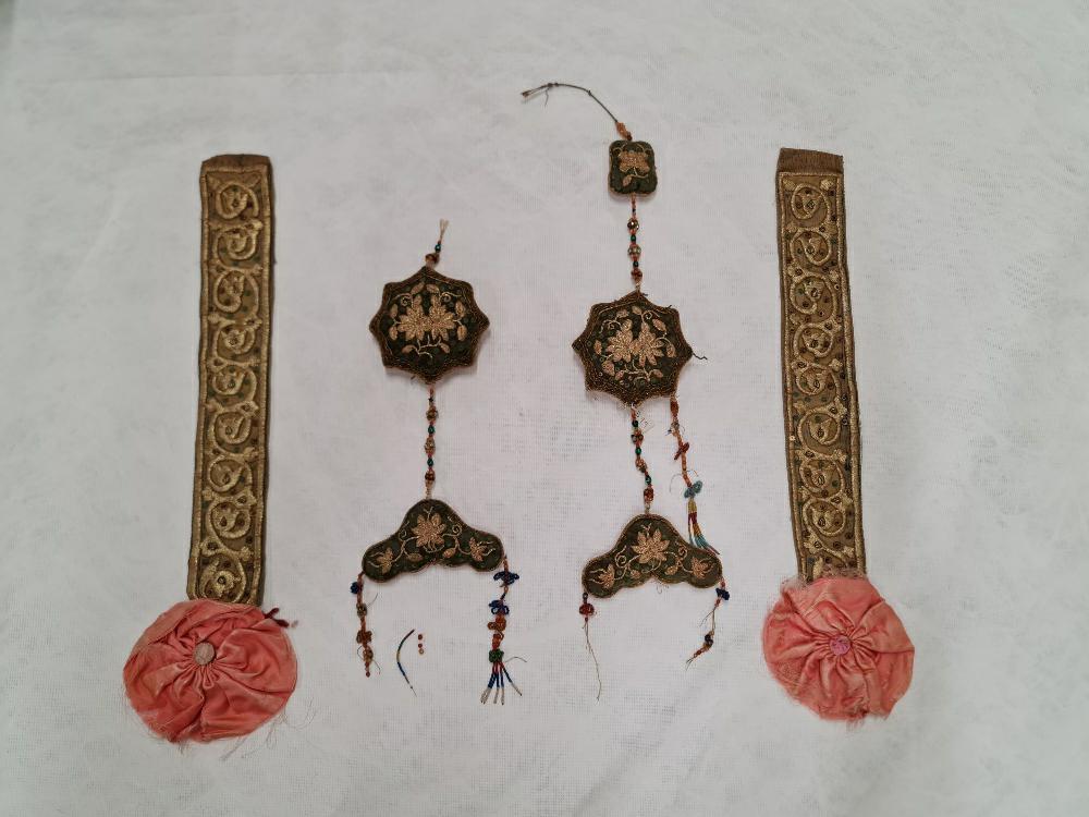 This pair of embroidered panels is decorated with Chinese auspicious motifs of butterflies, pheonixes and peonies. The borders are decorated with the eight buddhist emblems. During festive occasions like weddings, Peranakans used various, elaborate, decorative textiles and objects for ceremonies and presentation. Early pieces of silk and metal-thread embroidery show more Chinese or Malay influences, by the 20th century, European-inspired beadwork became popular.