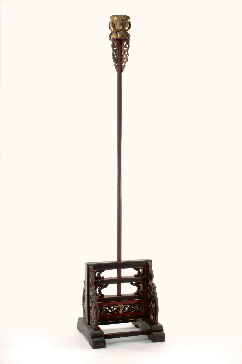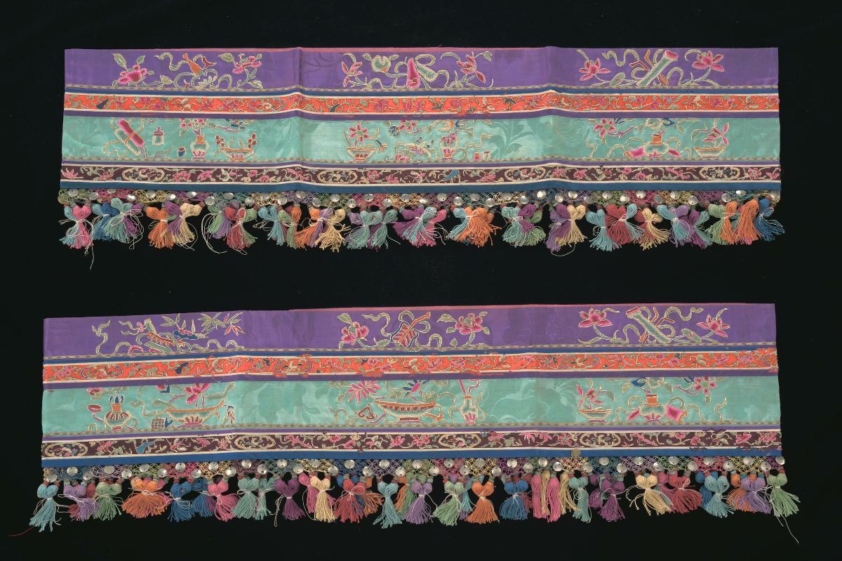 This pair of lantern covers is embroidered with auspicious motifs such as deer, qilin, elephant, pomegranates and peonies. Floral motifs and the eight buddhist emblems are used to decorate the upper part of the lantern cover. During festive occasions like weddings, Peranakans used various, elaborate, decorative textiles and objects for ceremonies and presentation. Early pieces of silk and metal-thread embroidery show more Chinese or Malay influences, by the 20th century, European-inspired beadwork became popular.