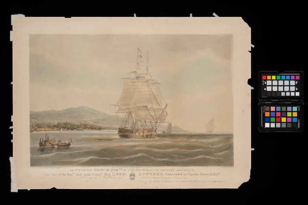 This is the logbook of British East India Company cargo vessel “Charles Grant.” Built at Bombay in 1810, the East Indiaman cargo vessel was owned by William Moffat. The ship made 12 voyages for the East India Company from 1810 to 1833. The logbook contains information such as the ship’s company, passenger records and route destinations: Bombay, Singapore, China, St Helena, England, Lintin and Whampoa Beach.