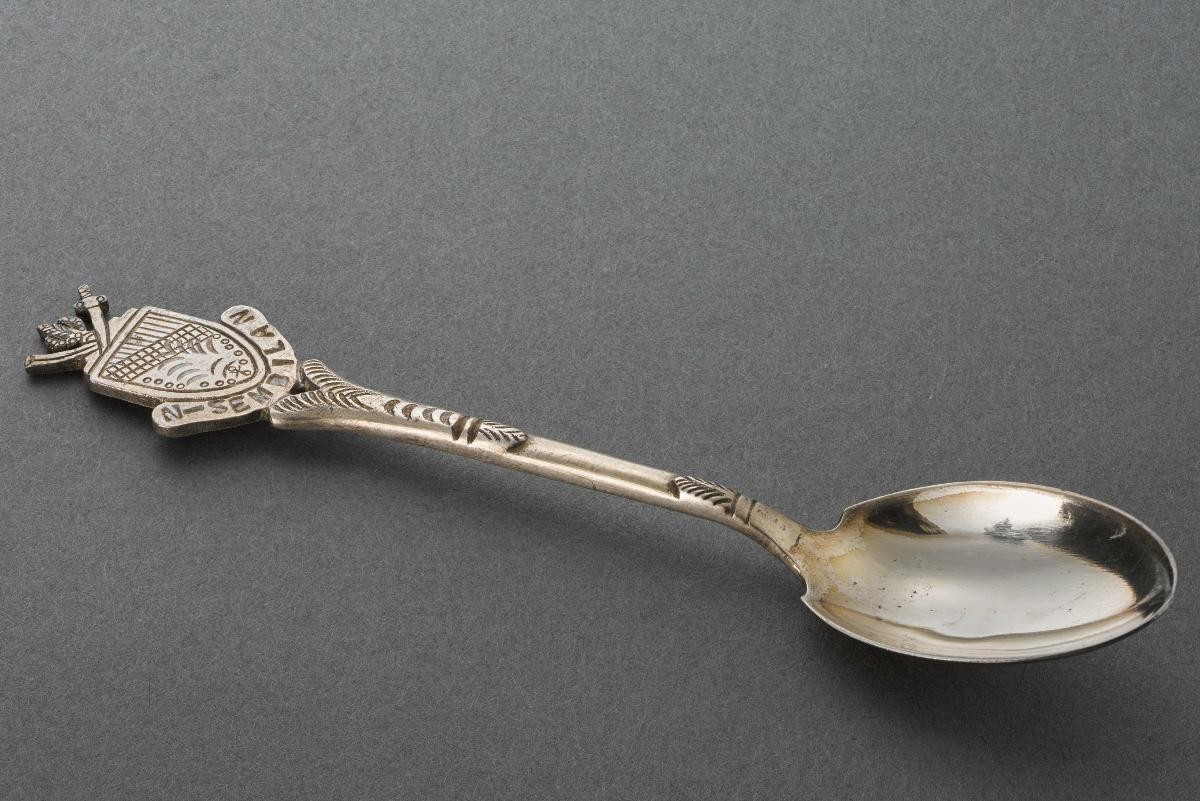 This silver spoon with the Pahang coat of arms is made by Mohd Salleh & Sons, a silversmith from Kota Bharu, Kelantan. It is part of a collection of decorative silver spoons which features motifs related to Singapore and Malaysia.