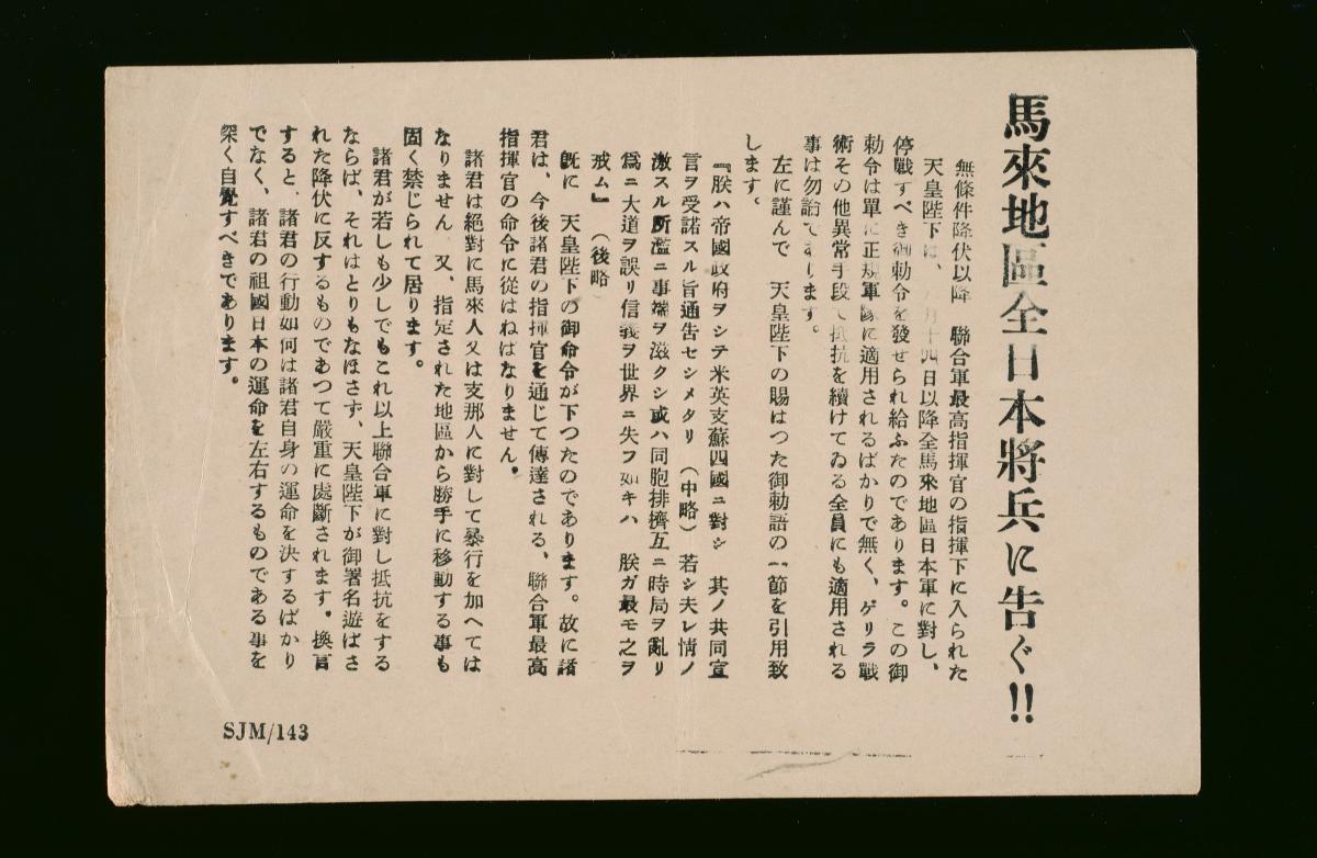 This leaflet was dropped by Allied aircraft, over the Changi Prison around 28 August 1945 under the operation codename, Birdcage, to inform the prisoners of war (POWs) about the surrender of the Japanese. The other side of the leaflet contains instructions to the Japanese regarding how the POWs should be treated, for fear that the Japanese commanders on ground had not learnt about Emperor Hirohito's surrender. The leaflet thus also helped to ensure the safety of the POWs and lift their spirits. The leaflet came fromAlbert Riley who held the rank of Private in the 196 Field Ambulance unit (part of the Royal Army Medical Corps) and later became a prisoner of war at the Changi Prison. Fortunately, he survived the imprisonment and hardship, and eventually returned to Britain after the surrender of the Japanese.