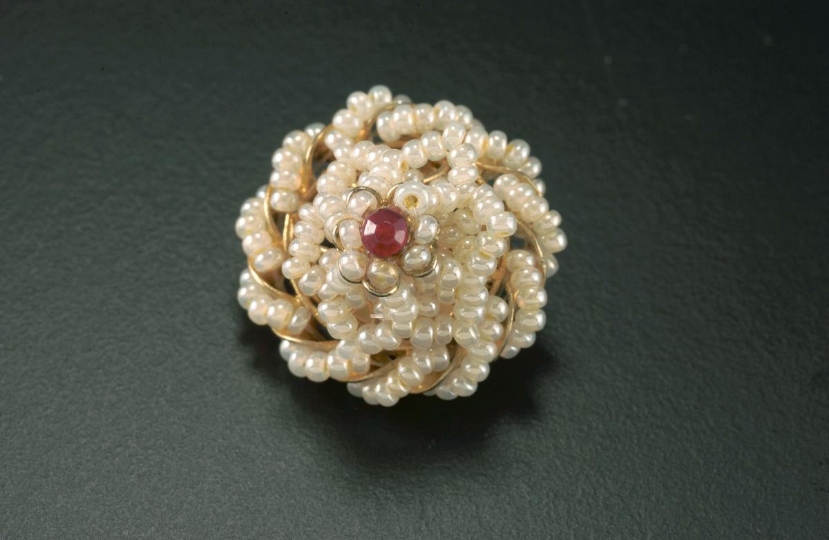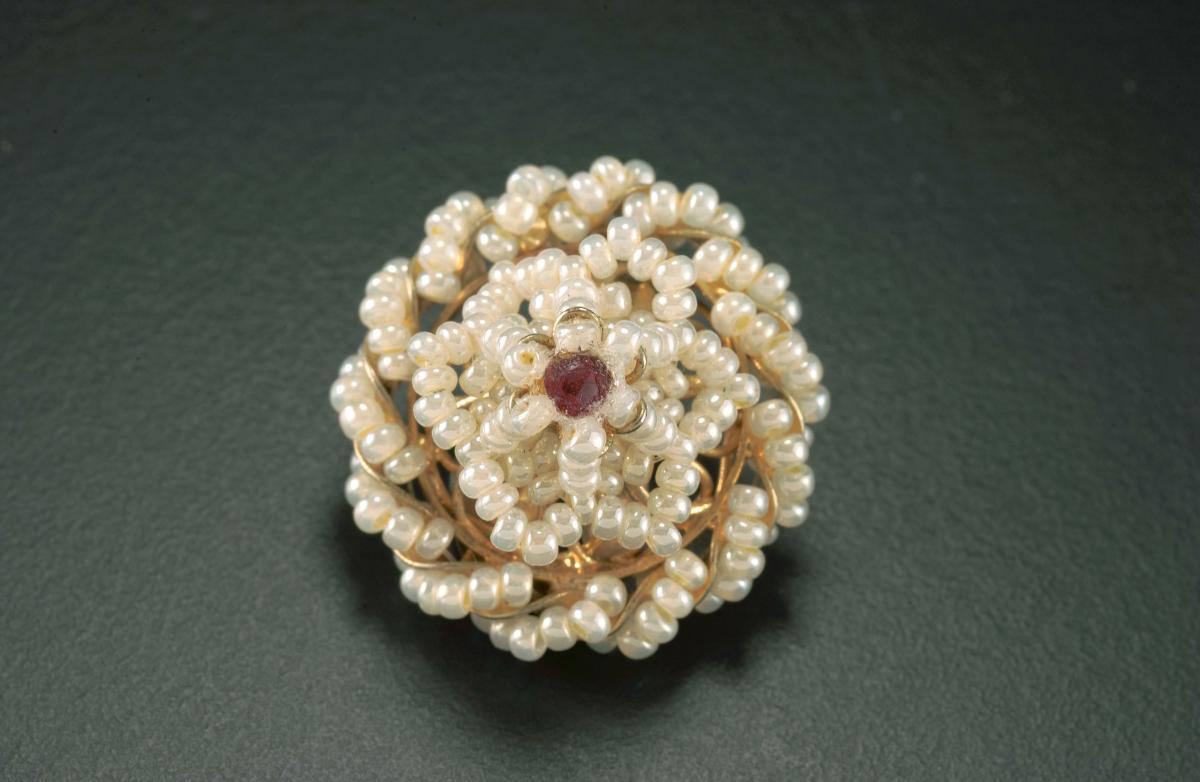 This exceptional pair of complex bugdi or koppu ear studs is of gold with heads of dozens of pearls, all secured by gold wire, surrounding a single ruby, similarly secured.The fasteners at the other ends screw in and comprise a cluster of pyramidal tips and have an overall clove-like form.Usually, these were worn in the upper part of the ear.The pair is in excellent condition, without losses.