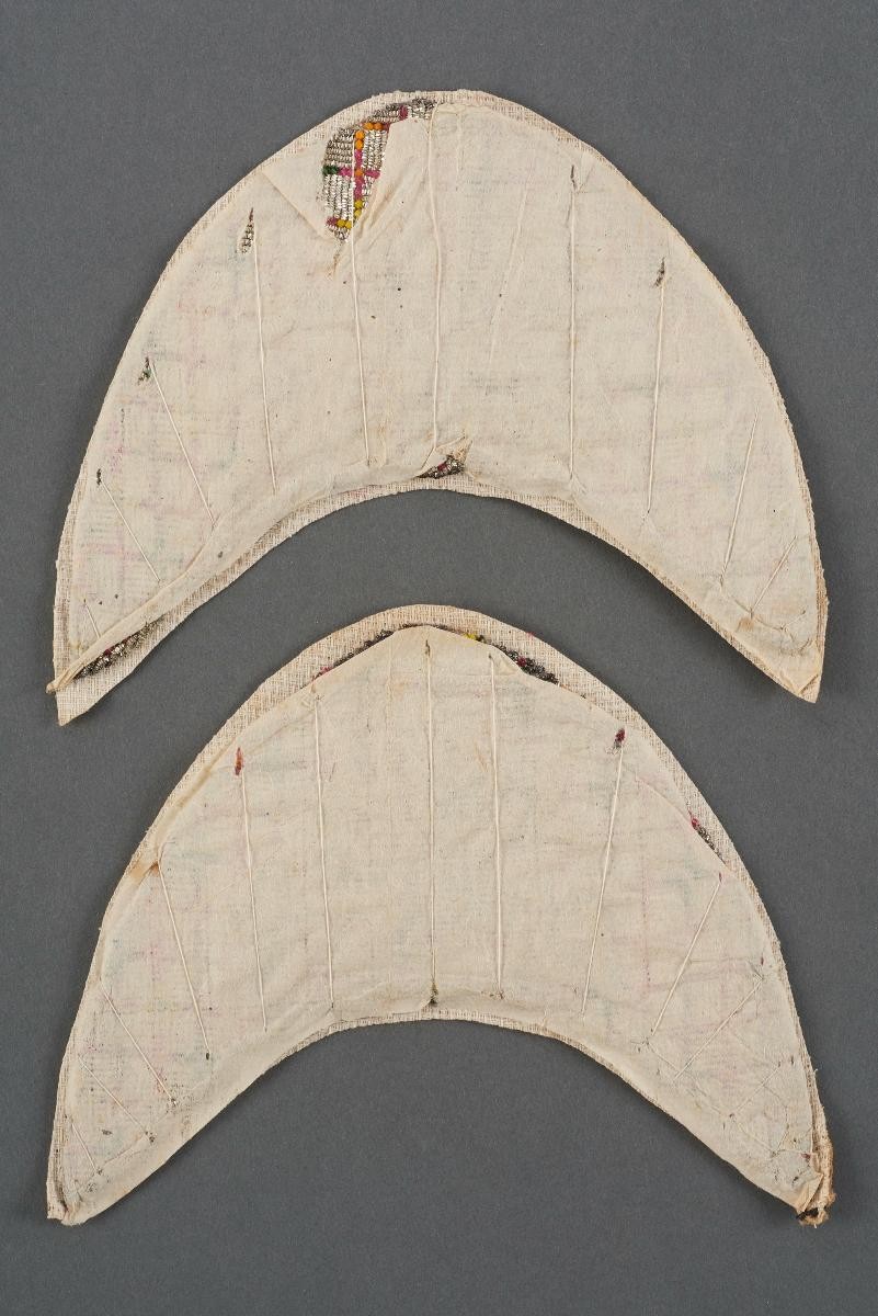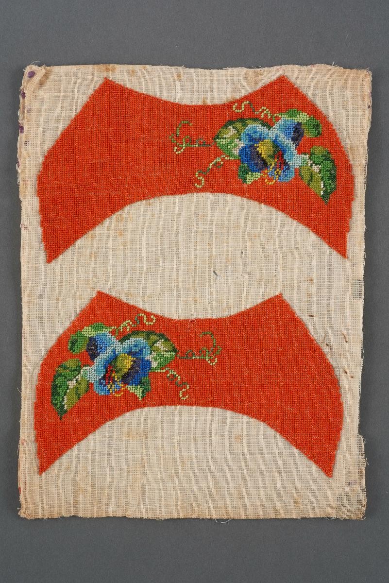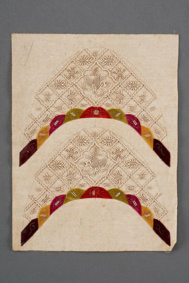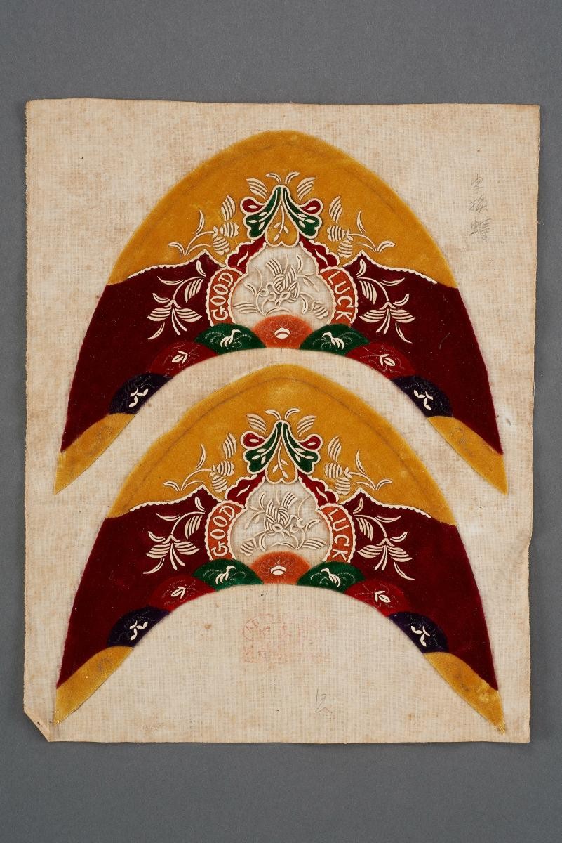This pair of unsewn slipper faces is created with a red, green, and yellow felt base. It is embroidered with a central, stylised motif of qilin (symbol of virility and felicitous offspring) amongst plants. The motifs are raised in high relief and to create this effect, thin strips of cardboard are pasted on the parts of the outline to be highlighted. The motifs are then embroidered to create the slipper faces. The slipper faces would have been sent to Chinese shoemakers to be cut out from the frame and made into the final product. Such slippers were originally part of the wedding items purchased or sewn by the bride’s family for use in her wedding, but these were later worn on other occasions as well.This object belonged to Wee Bee Neo, a prominent Sang Khek Umm or mistress of wedding ceremonies. As a wedding specialist, she was in charge of the bride’s hair and jewellery, and guiding the young lady through the proper rituals.
