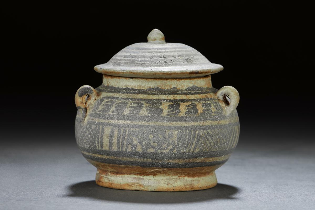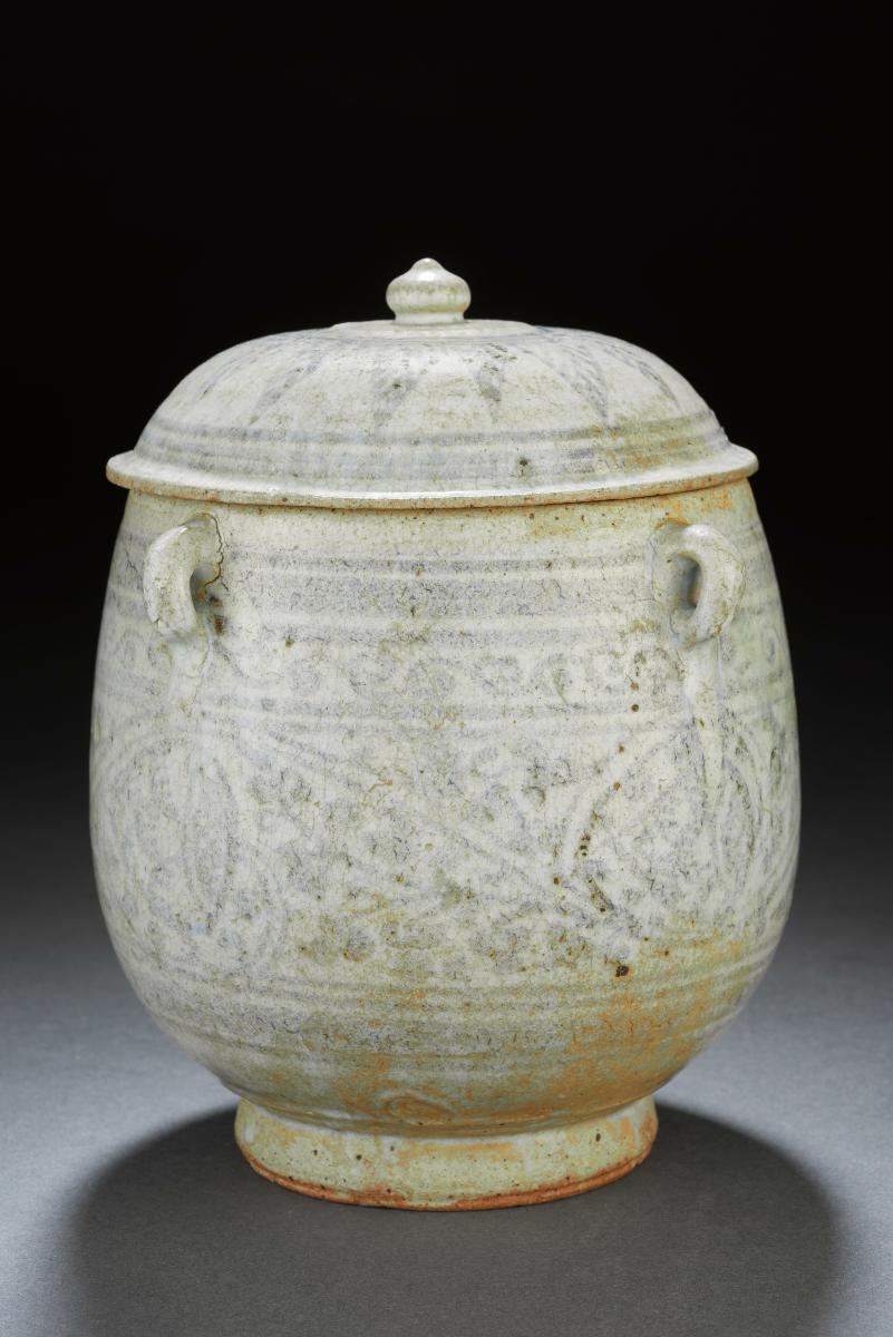 This globular jar with four lugs on its shoulder is covered with a creamy-white glaze that falls short of the lowest section of the body. Although celadon wares were the best-known product of the Sawankhalok kilns, the potters also made ceramics covered in other monochrome glazes such as that on this jar. The Sawankhalok kilns in north-central Thailand began producing glazed stonewares around the mid-14th century. During the peak period of Sawankhalok’s export trade (15th–early 16th century), some 1,000 kilns may have been in operation