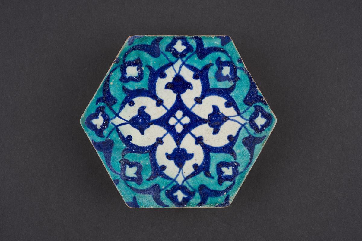 Typical of Indian tile production, Bijapur tiles are made of red clay, covered in white slip and decorated with underglaze painting. This tile bears a turquoise rhomboid or diamond-shaped motif in the centre, framed by arabesque ornamentation in cobalt - a colour palette signalling the influence of Persian culture and aesthetics. Bijapur served as the capital for the Adil Shahis between the 15th and 17th centuries. The Adil Shahi dynasty was founded by Yusof Adil Khan, who had migrated from Iran to India in the late 15th century. Bijapur was the first province to proclaim independence following the rapid decline of the preceding Bahmani kingdom, and on account of Yusof's professed faith, the first Indian Shi'ite state, thus proclaimed soon after the Safavids declared Shi'a Islam as the state religion of Iran.