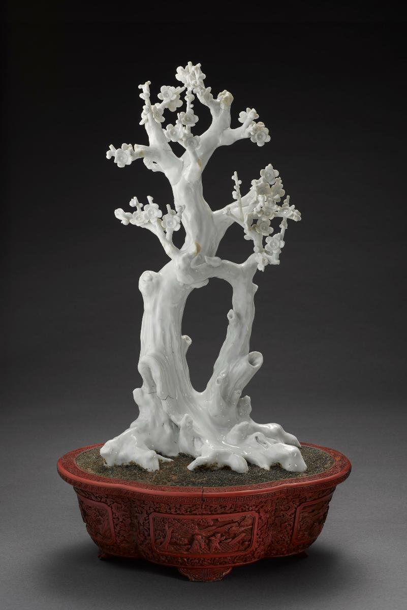 This figural group which comprises a prunus tree, large rock, and two ladies highlights the skill of Dehua potters at creating sculptural works. The tree's gnarly trunk and roots, twisting branches and flowers in varied sizes and phases of bloom, coupled with the lively and detailed rendering of the two ladies beneath it, imbue this piece with dynamism. Prunus or plum blossom trees were among the sculptural pieces created by Dehua potters during the 18th and 19th centuries, and appears to have been made for the European market. These trees varied in size and the details included, this example appears to be among some of the largest and most complex created.