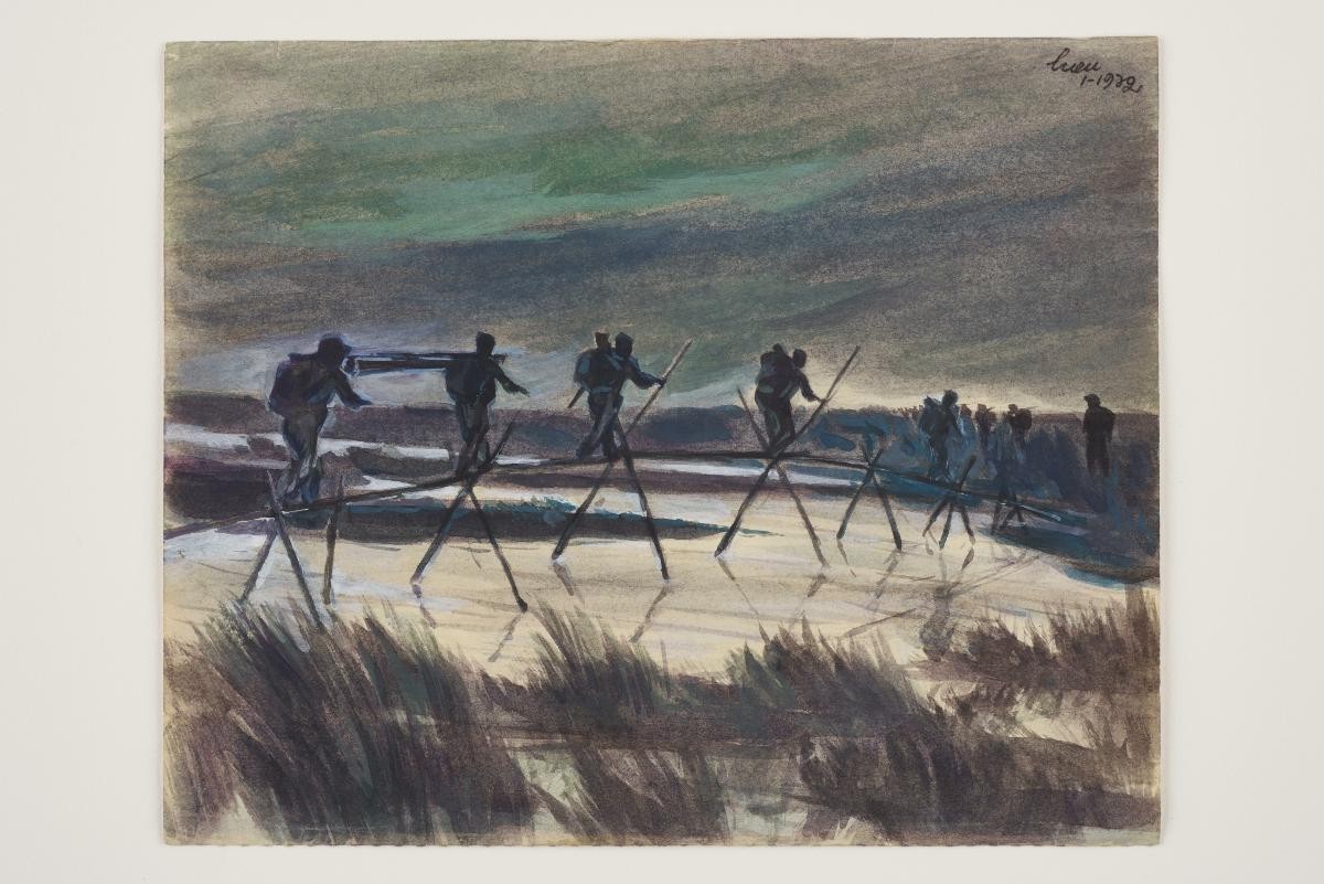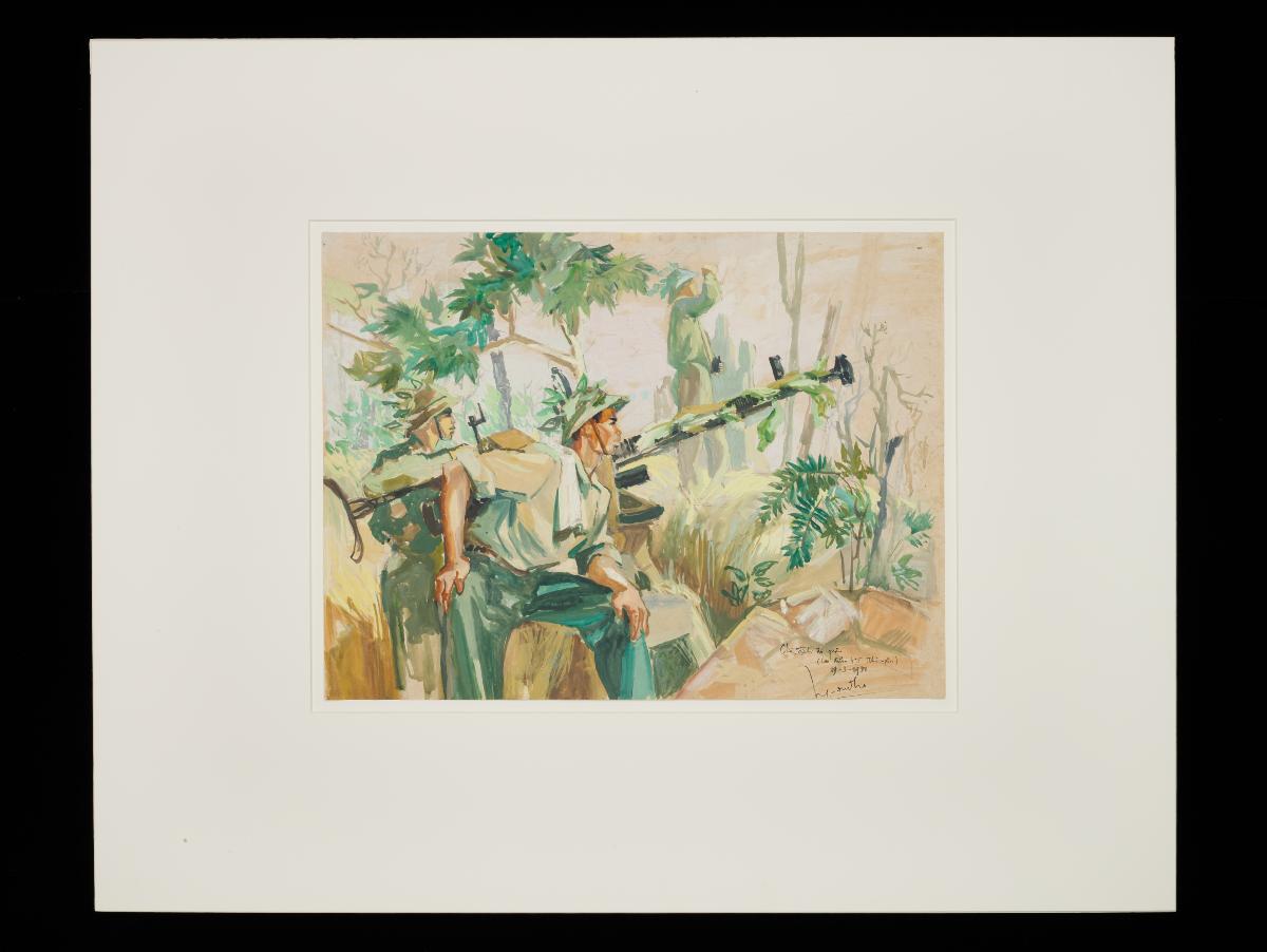 Khamsouk Keomingmuang (b. 1941, Laos) is one of the most senior and respected artists in Laos, and was the first artist to be conferred the title of National Artist in the country. He was educated in Hanoi for 12 years prior to 1975, before returning to live and work in Vientiane.This artwork is from a collection of 13 war drawings and other works on paper by Khamsouk dating to the early 1970s held in the Gallery's collection. Small pen, pencil, and watercolour sketches, these works depict scenes of military activity during the Second Indochina War, as well as aspects of daily life in the period. These are among the only known extant artworks from Laos dating to the early 1970s not held in national institutions within Laos. The works are quickly executed, mostly in situ, yet the compositions are quite well-developed for war drawings of their kind.