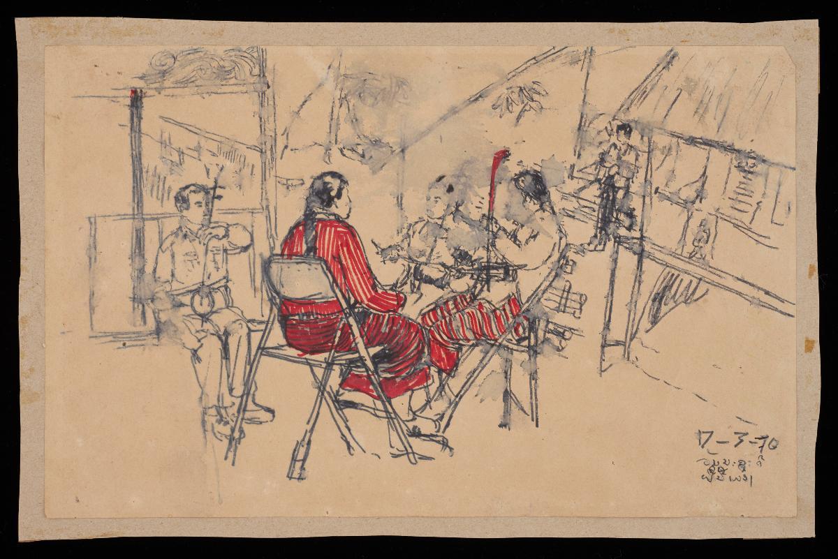 Khamsouk Keomingmuang (b. 1941, Laos) is one of the most senior and respected artists in Laos, and was the first artist to be conferred the title of National Artist in the country. He was educated in Hanoi for 12 years prior to 1975, before returning to live and work in Vientiane.This artwork is from a collection of 13 war drawings and other works on paper by Khamsouk dating to the early 1970s held in the Gallery's collection. Small pen, pencil, and watercolour sketches, these works depict scenes of military activity during the Second Indochina War, as well as aspects of daily life in the period. These are among the only known extant artworks from Laos dating to the early 1970s not held in national institutions within Laos. The works are quickly executed, mostly in situ, yet the compositions are quite well-developed for war drawings of their kind.