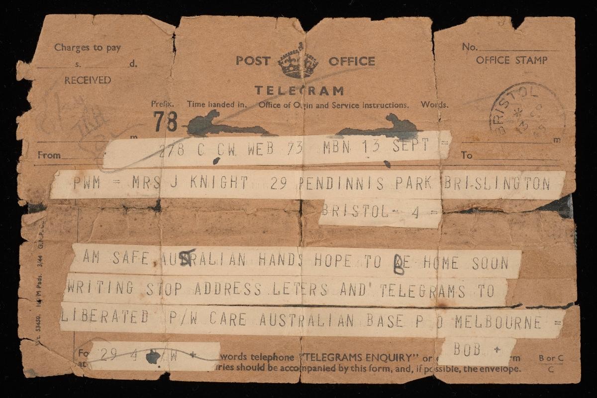 This is a cablegram from Robert K. Knight to a Mrs J Knight of 29 Pendennis Park, Brislington, Bristol, reading: "Arrived Victoria safe and well home early November cable by return Gordon Head Camp Victoria BC Love = Bob +". Robert K. Knight was a Lance Corporal with the Royal Norfolk Regiment. The 4th, 5th, and 6th battalions of the regiment were attached to the 18th Division, which was sent to Singapore in January 1942 and slated to defend the Changi area. Knight was captured during the fall of Singapore.