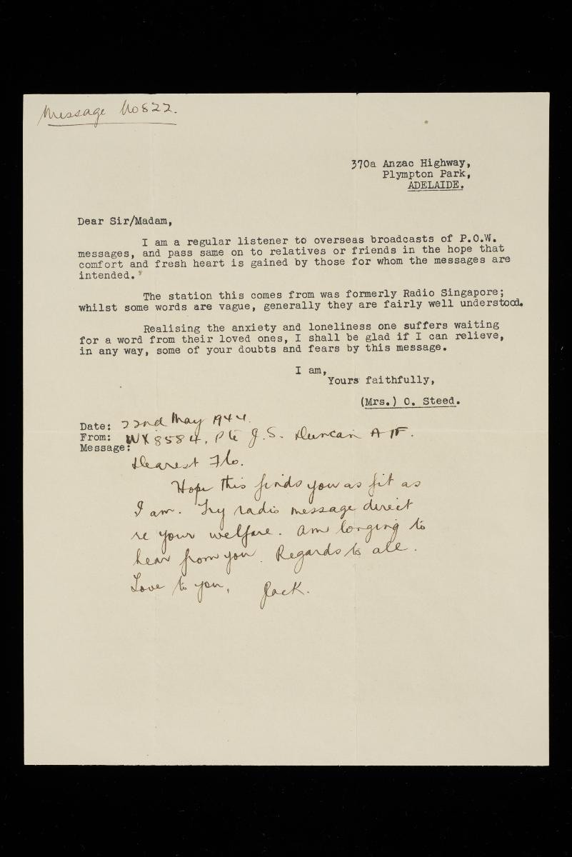 This letter, sent by the Echelon and Records office of Western Australia, informs Mrs. J. S. Duncan that a message in her husband's name was read out during a Japanese propaganda programme broadcast from Singapore. It warns that the message may be inauthentic given the source.