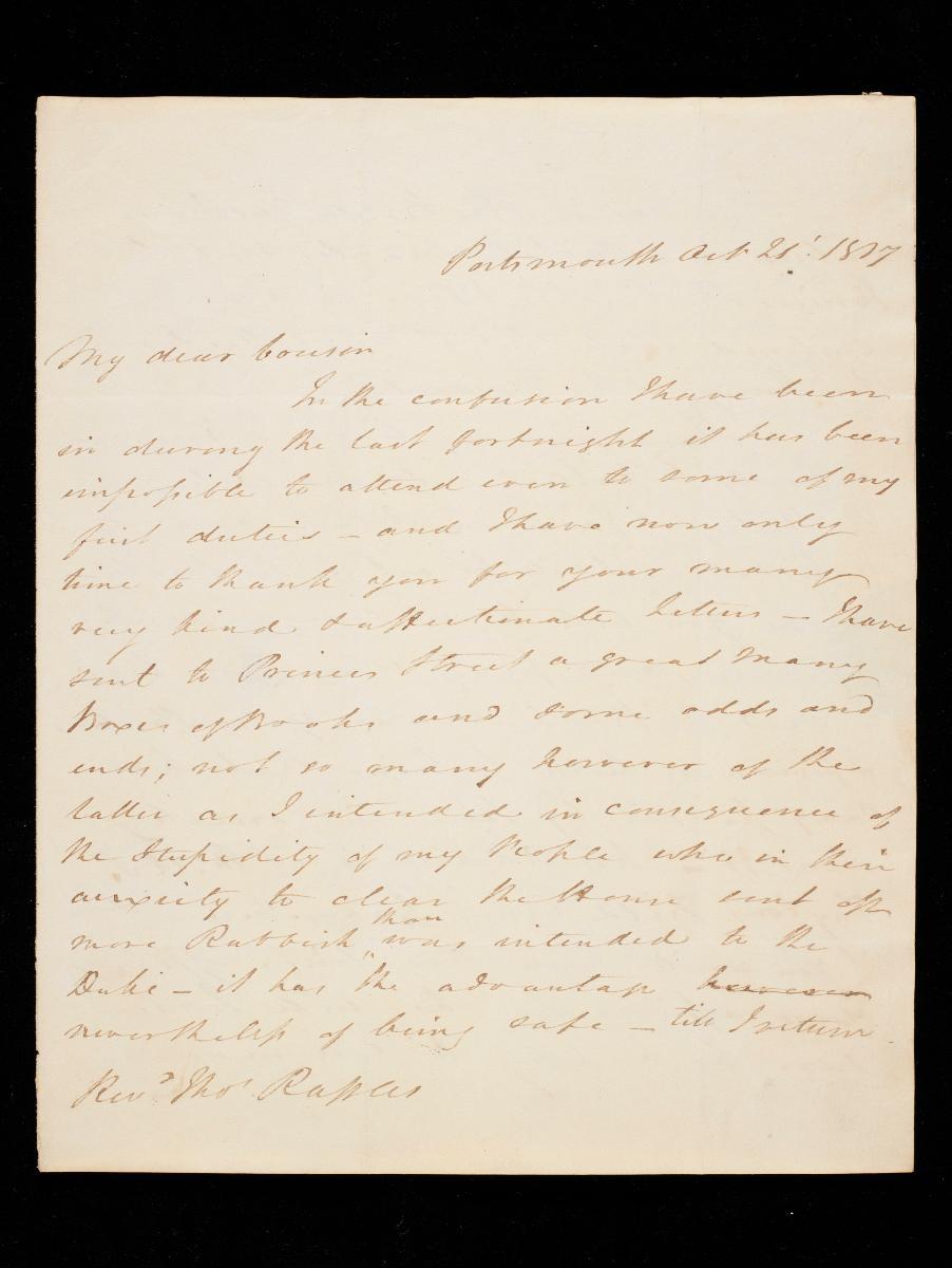 Sir Thomas Stamford Raffles established a British East India Company trading factory in Singapore in 1819. This letter was written to his uncle William Raffles the father of the Revd Thomas Raffles in 1812, thanking his uncle for paying attention to his mother Ann. It was sent from Buitenzorg (Bogor today), where Raffles was Lieutenant-Governor of Java.