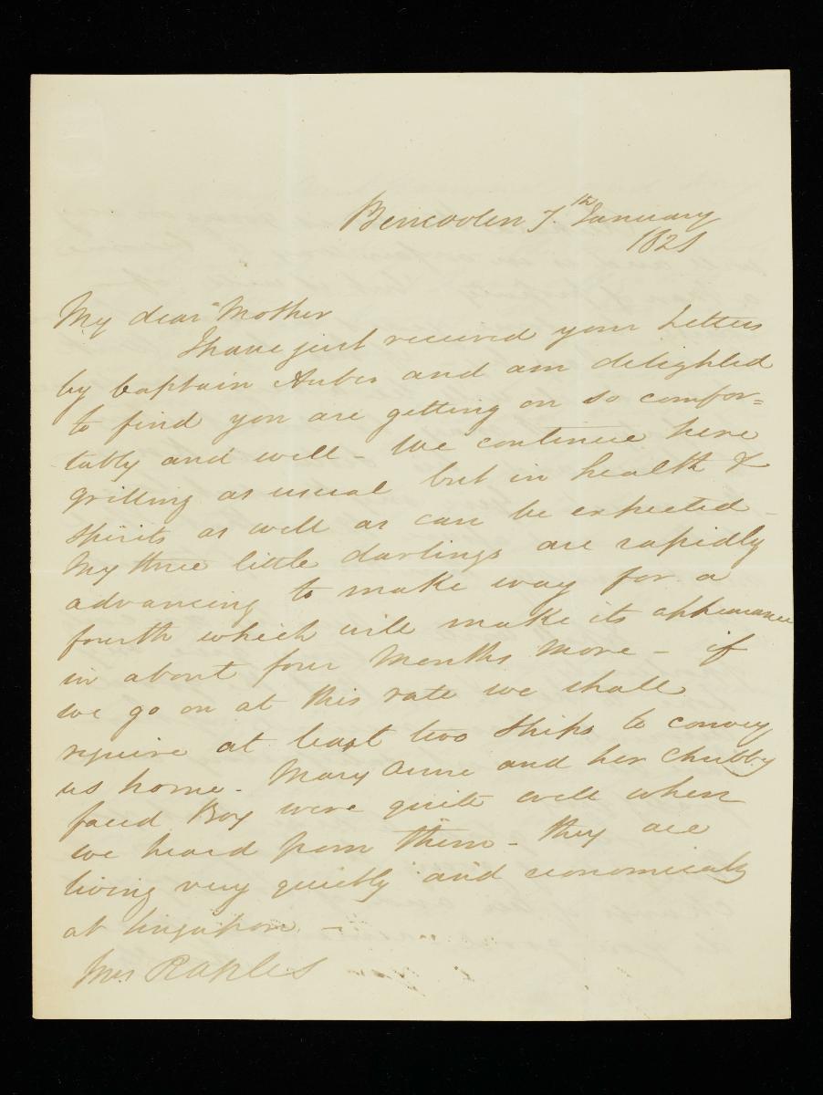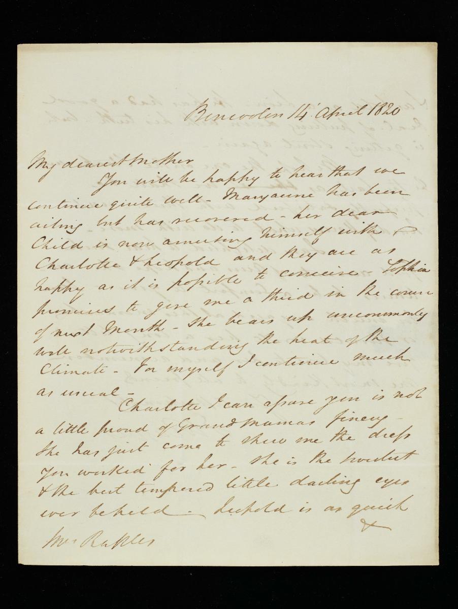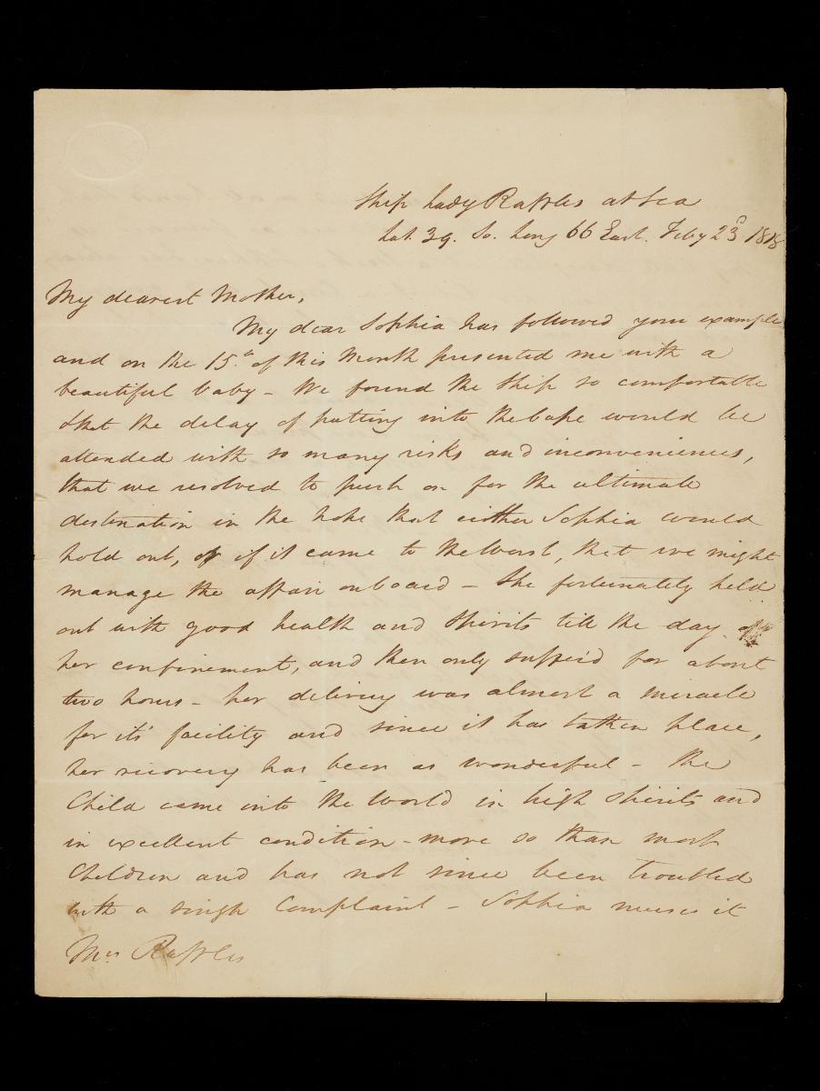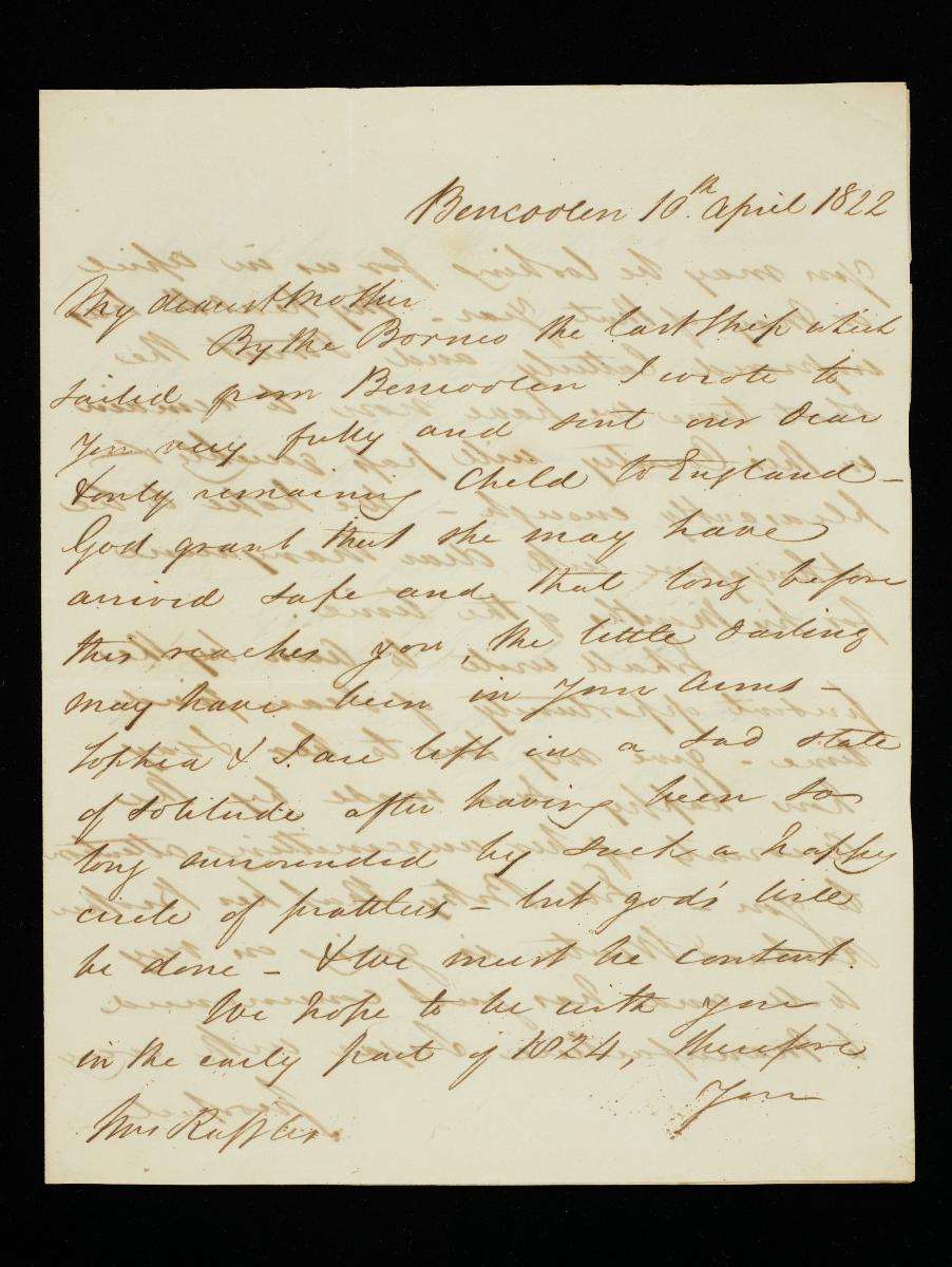 Sir Thomas Stamford Raffles established a British East India Company trading factory in Singapore in 1819. This letter is part of a collection of letters he wrote to his mother Ann, for whom he had a great love. It was written from Bencoolen, where Raffles was Lieutenant-Governor, bearing news of the death of his son Stamford Marsden.