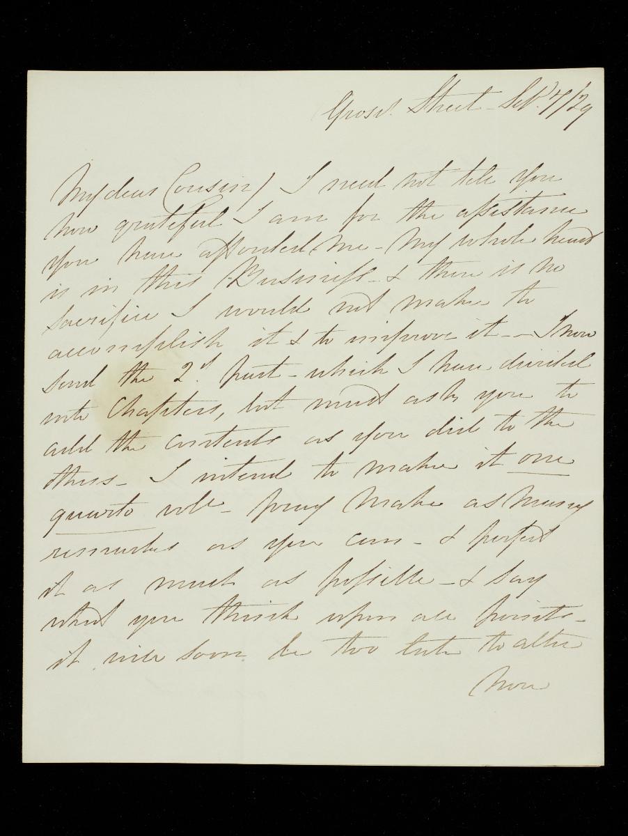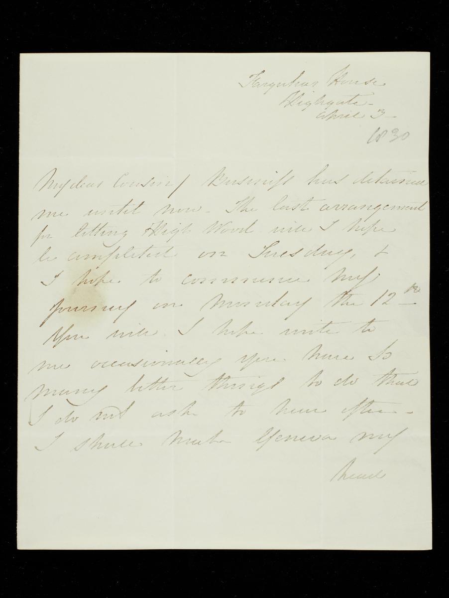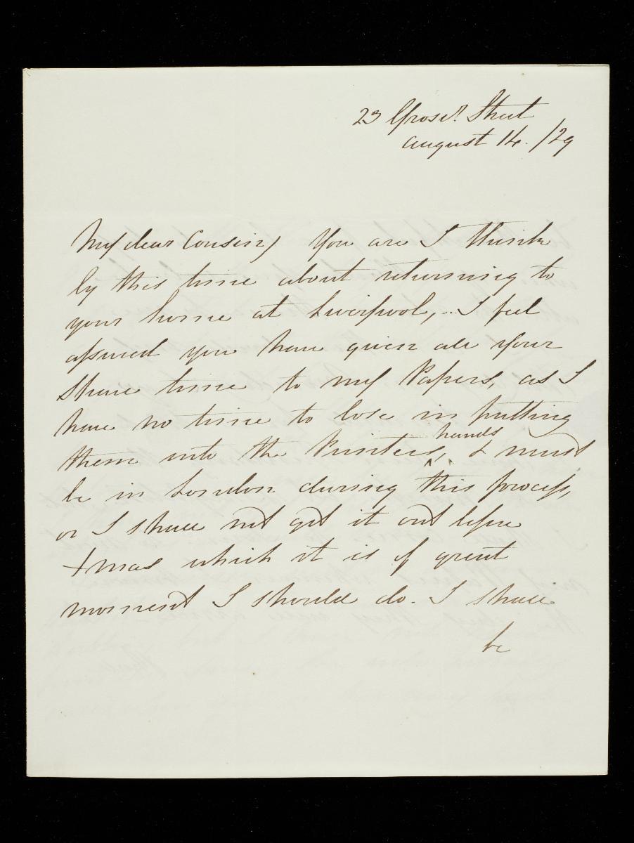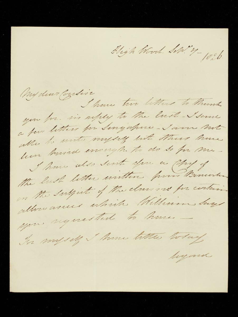 Lady Sophia Raffles was the wife of Sir Thomas Stamford Raffles, having married him in 1817. This letter is part of a collection of letters written by her to the Revd Thomas Raffles, who was her husband’s cousin. In it, Lady Raffles mentions the death of Captain William Lawrence Flint, Raffles’ brother in law, and the plans for his wife and Raffles’ sister Mary Anne and their daughter to return to England. Flint was Singapore’s first official Master Attendant.