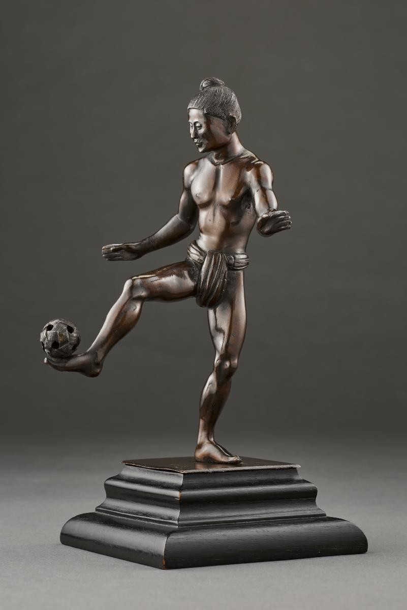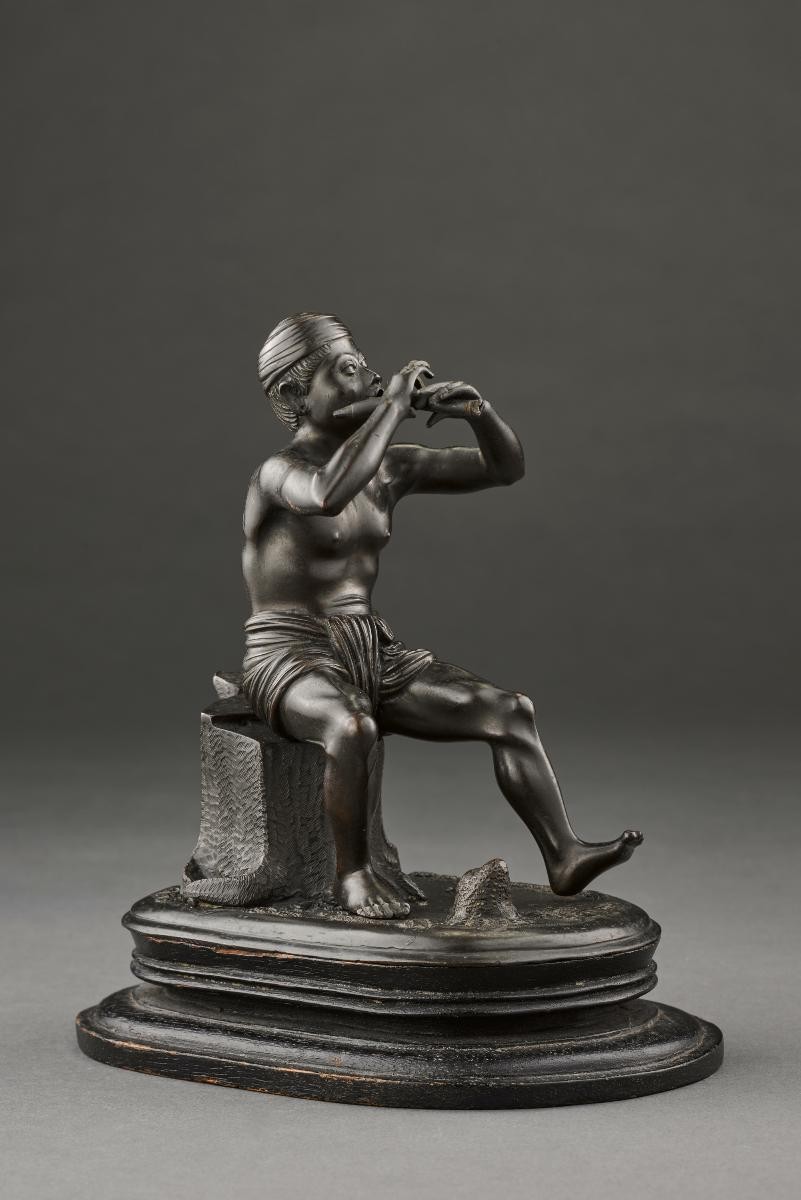 Small, cast-bronze sculptures on wooden stands, known as “Pegu bronzes” and made in present-day Bago (approximately 90km northeast of Yangon), were produced during the 1920s and 1930s by Burmese makers. Although many “Pegu” bronzes are unsigned and thus anonymously made, some makers of “Pegu” bronzes stamped their name onto the sculptures. The most commonly seen name is Mg (Maung) Hpo Hla, and other names found on the proposed items include Mg (Maung) Tha Din, Mg (Maung) San Wa, and Mg (Maung) Po Kyaw. No biographical details are known for any of these makers (other than that they were all male, as evidenced by the use of the honorific “Maung” in their names), and no research (archival or on-site in Bago) is known to have ever been conducted to attempt to locate any biographical information on these figures. The most art-historically significant and fascinating aspect of “Pegu” bronzes is their adherence to principles of realism, in both their naturalistic modelling and pose, and their fine detailing and finish. “Pegu” bronzes first emerged soon after Western-style realism appeared in Burmese painting, and contemporaneously with the explosion of popularity for photography and postcards, produced in Myanmar in studios operated by South Asians, Burmese, and Europeans.In many “Pegu” bronze figures, this realist effect is plainly achieved in large part through trans-media references to photography and realist painting. Similar or identical poses and props appear in “Pegu” bronzes as found in well-known and widely reproduced two dimensional images. In other examples, realism is achieved through a naturalistic and dynamic pose of figures in action. Despite these links to modern media, “Pegu” bronzes also relate to older Burmese styles of naturalistic statuary. These include 19th century images of the Buddha’s disciples, and also older images of temple guardians. “Pegu” bronzes appear to have been produced largely for export, chiefly to the British market. During the 1930s, “cottage industries” expanded massively in Myanmar, encouraged by British colonial authorities, following the collapse in rice prices in 1929, Burma’s separation from British India in 1930, and the contemporaneous economic collapse of the Great Depression.