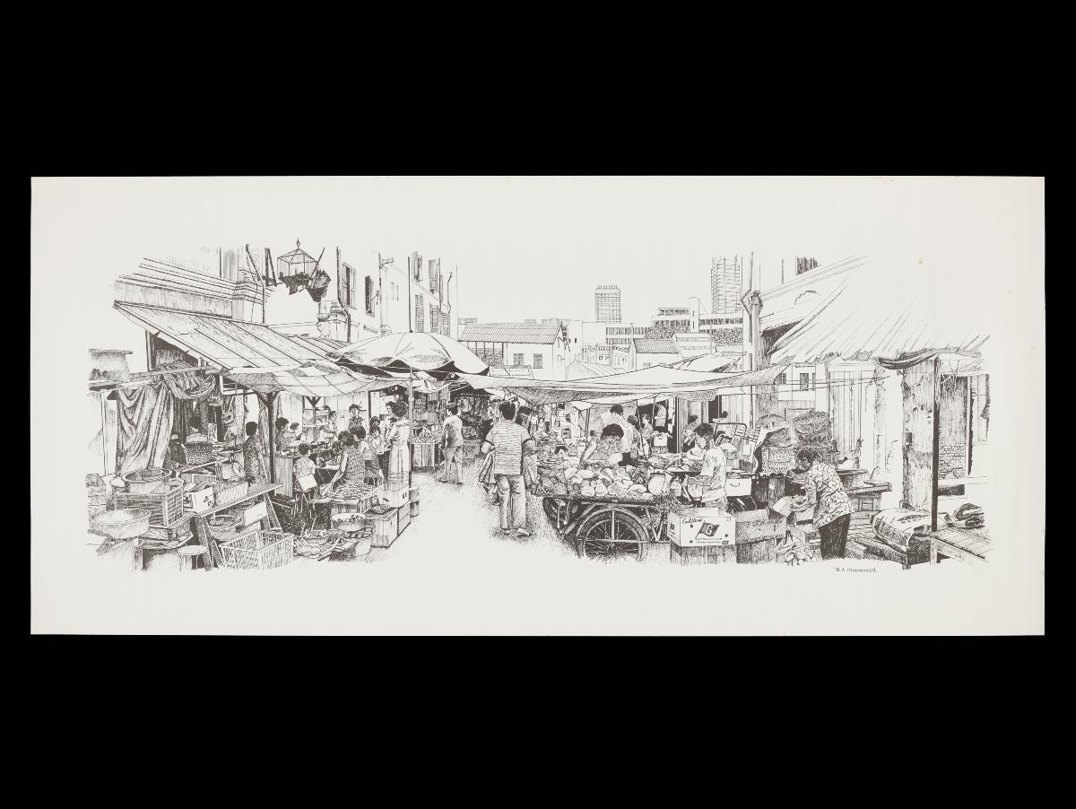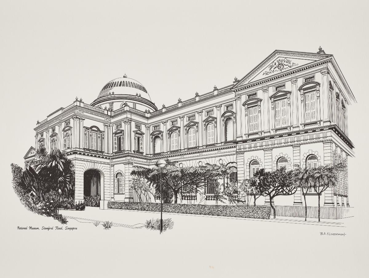 This is a line drawing of the Chesed-El Synagogue in Singapore by Ben Kloezeman. Kloezeman, a former art director of Dutch-Indonesian descent at advertising firm Mccann-Erickson, was known for his fine line drawing technique. Following his retirement in the mid-1970s, he pursued a career as a freelance artist and designer, creating a series of art inspired by buildings and scenes in Singapore — of which this drawing is one.