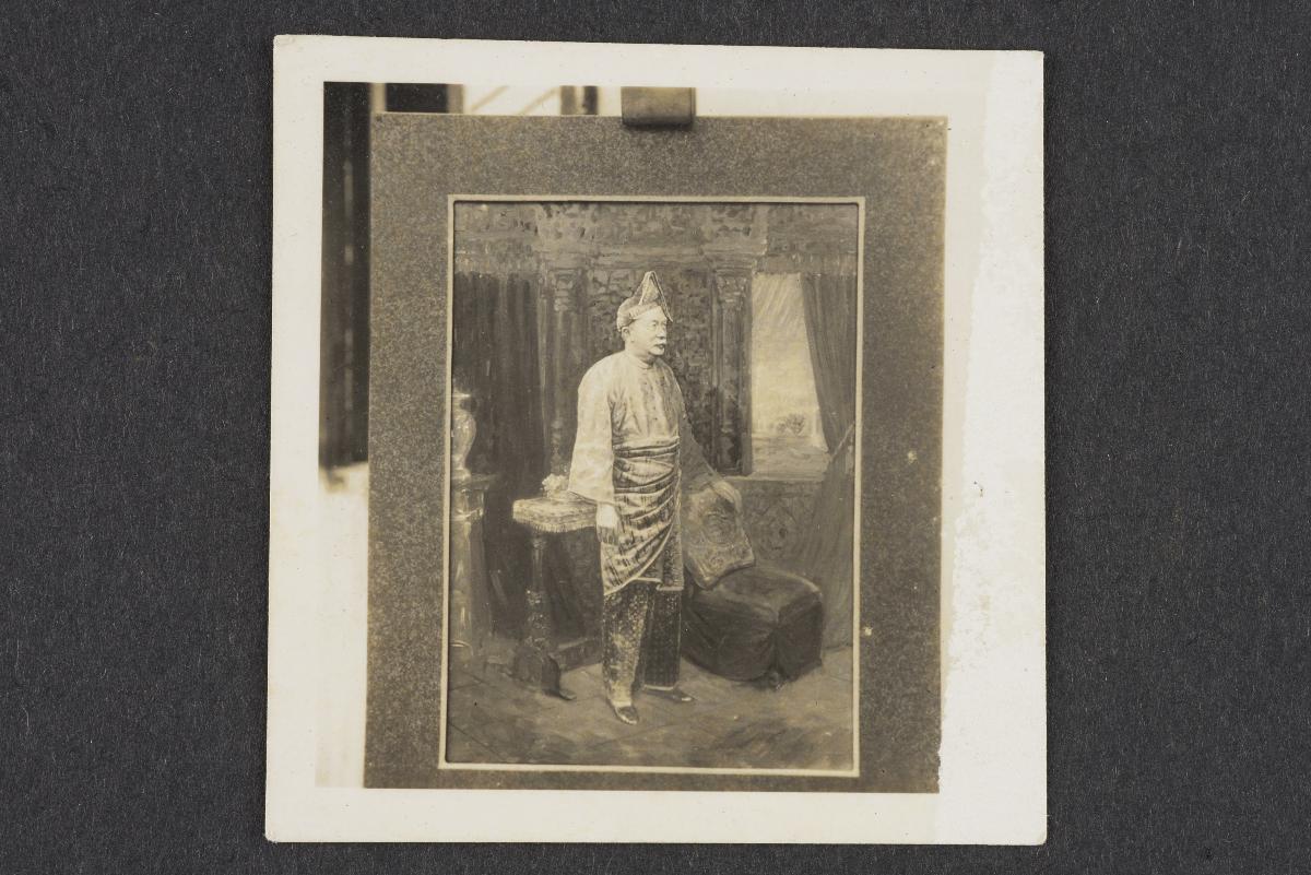 The central figure, possibly Sultan Sulaiman of Selangor, stands in the middle, with his right profile featured and his left arm resting on the backrest of chair. The setting is akin to the set-up of a studio portrait with the props arranged as accompaniments to the portrait. Based on the visual observation by HCC conservator, the image is likely to be a black and white photograph with oil and pastel applied on to it. The 1900s-1940s was a period wherein the lines between painting and photography, patronage and individual practice are blurred. Between the 1900s and 1940s, hand-coloured photography was popular as gifts and souvenirs amongst elites and the middle class as the technique heightens the realism of monochrome photographs. This work is a rare example of Low’s experimentation with various media and a demonstration of the relationship between photography and painting in the early 20th century.