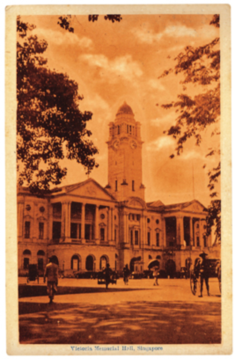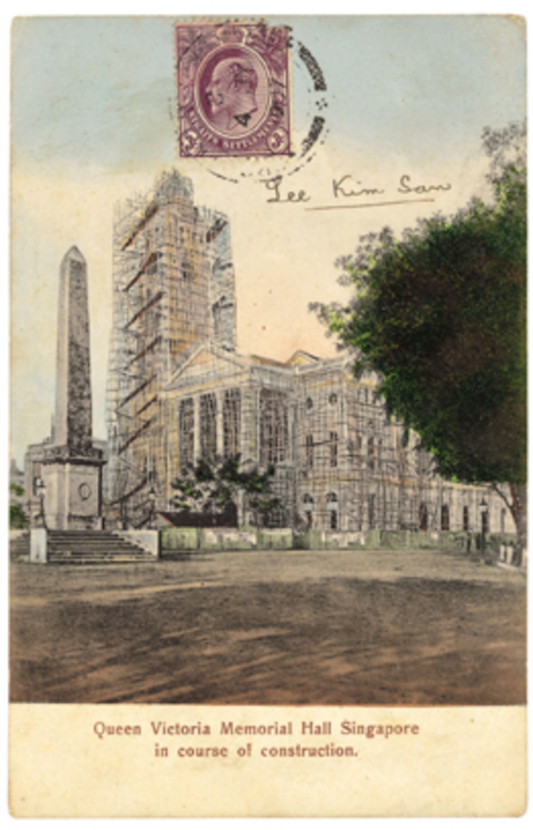 This postcard depicts the Victoria Memorial Hall in the foreground, with the Europe Hotel in the background. The sender appears to have been more interested in the Europe Hotel - an arrow on the photo points out the ‘Hotel D’Europe’, where the sender may have been staying. The Europe Hotel, Singapore, was established at Hill Street in 1857. It later shifted to Beach Road and then to the Esplanade in 1865. It was later rechristened the Grand Hotel de l’Europe, and finally renamed the Europe Hotel in 1918 after a change in ownership. It was demolished in 1934 to make way for service flats.