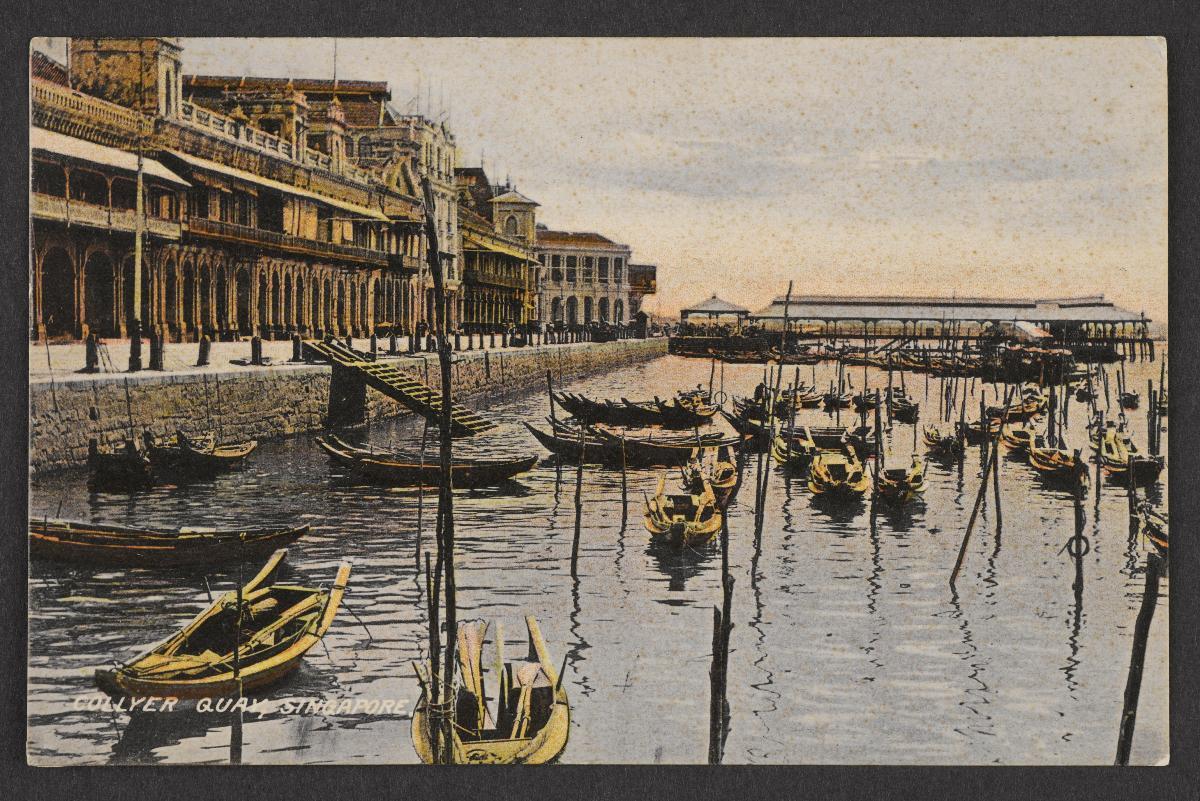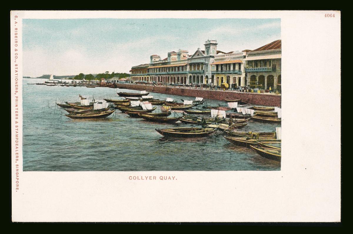 This postcard depicts Collyer Quay in Singapore in the early 1900s. A row of cars line the left side of the street, and a tram rattles down the street on the right, while in the foreground a rickshaw is being pulled. This variety of modes of transport provides interesting insight in to the rapid pace Singapore developed such that both less technically advanced and more technically advanced forms of transported coexisted. On the left of the postcard, the arcade style building in an oriental style was one built by the Alkaff brothers.