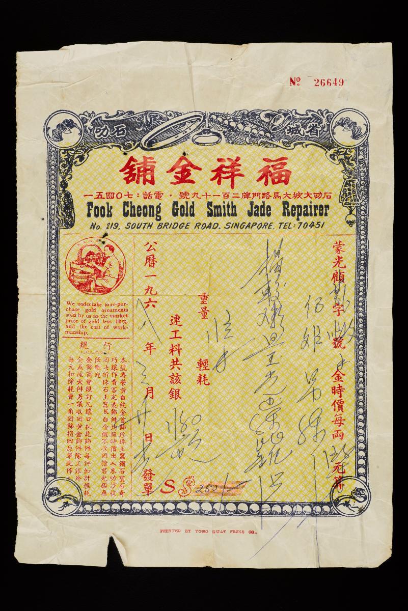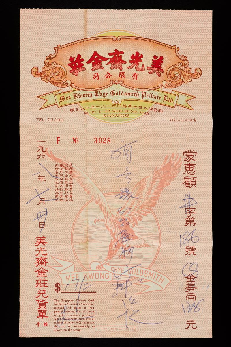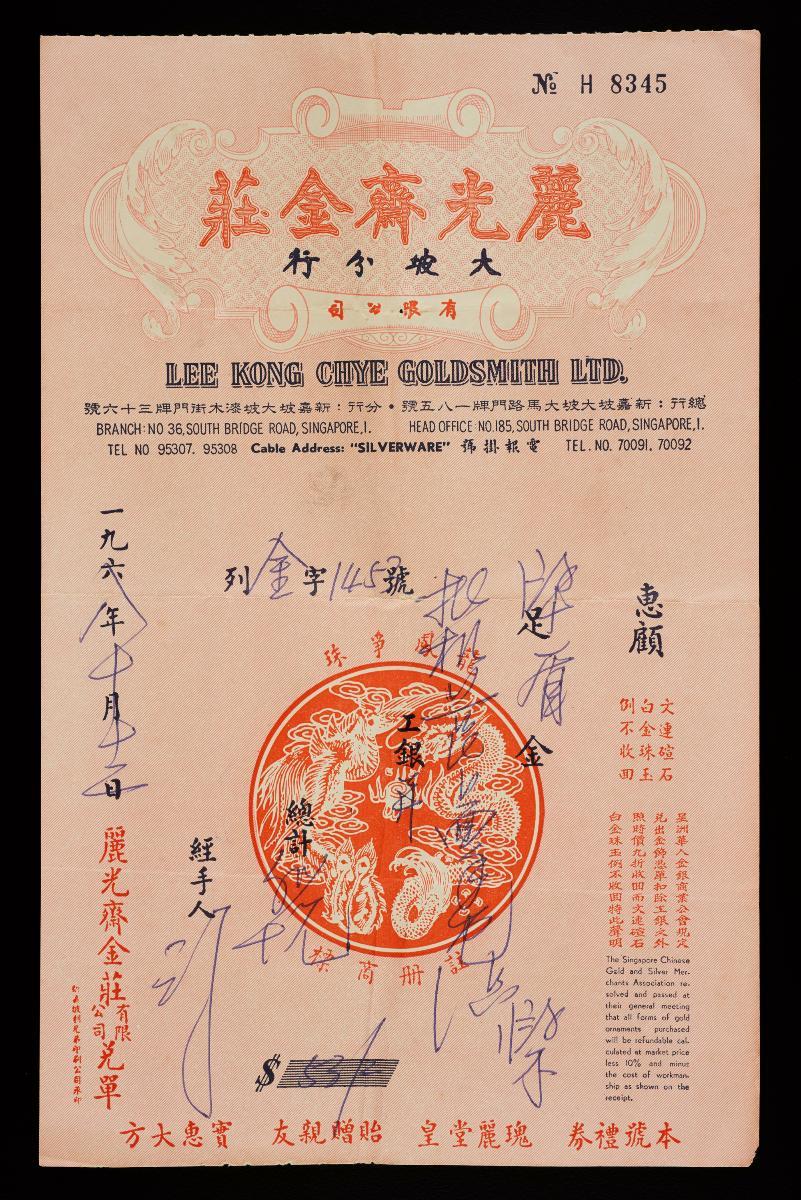 This is a receipt from Lee Onn Co., Ltd Goldsmiths and Jewellers for the jewellery gifts received by Lee Guat Hiong at her wedding in 1968. Gold, a symbol of wealth, nobility, and good luck for Chinese people, has customarily been given at weddings and other celebratory occasions. In the 1950s in Singapore, there were more than 20 goldsmith shops established by the Cantonese along South Bridge Road. Many opened early in the 20th century. This receipt depicts a miniature illustration of the Lee Onn shopfront and an illustrated view of the Singapore river as it would have appeared then.