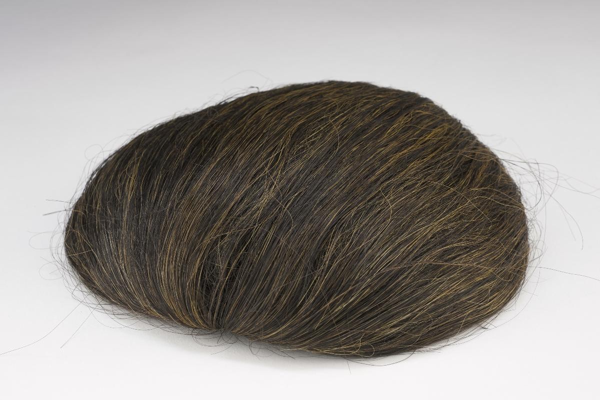 The 1960s were a revolutionary time for women's fashion, and hair was no exception. Wigs and hairpieces would be worn for convenience as well as for a particular aesthetic. The woman's real hair would be coiled or bunned underneath the hair piece. This wig is made of 100% human hair, and manufactured in Hong Kong.