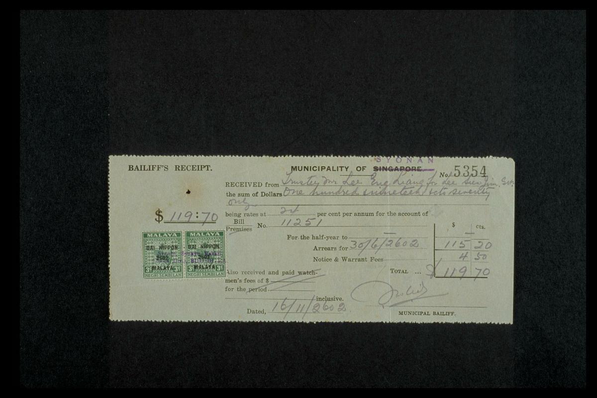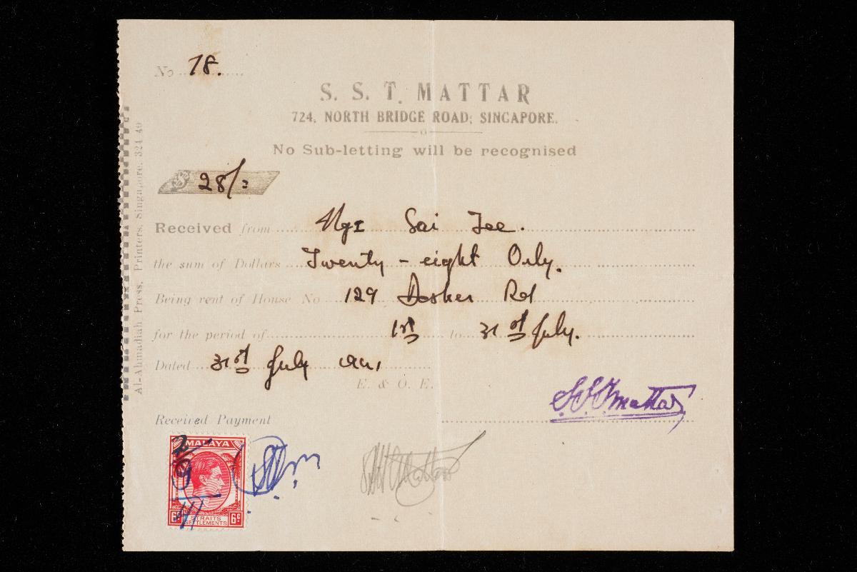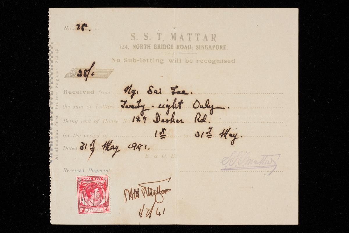 The document is a receipt that serves as proof of payment of rent for a property on Pulau Tekong. Dated to 25 December 2604 (in Japanese calendar, 1944 in Gregorian calendar), illustrates a transaction for payment of rent for property at 'Kampong Selabin', located in present-day Pulau Tekong. Written in Jawi, the document was commissioned for the landlord of said property, identified only as 'Tunku Petri Badariah, Tekong Besar' (the latter being the name of one of two islands that now make up Pulau Tekong) by 'Al-Ahmadiah Press', a printing house located in Kampong Gelam that was responsible for various seminal Malay-language publications in the early- to mid-20th century.