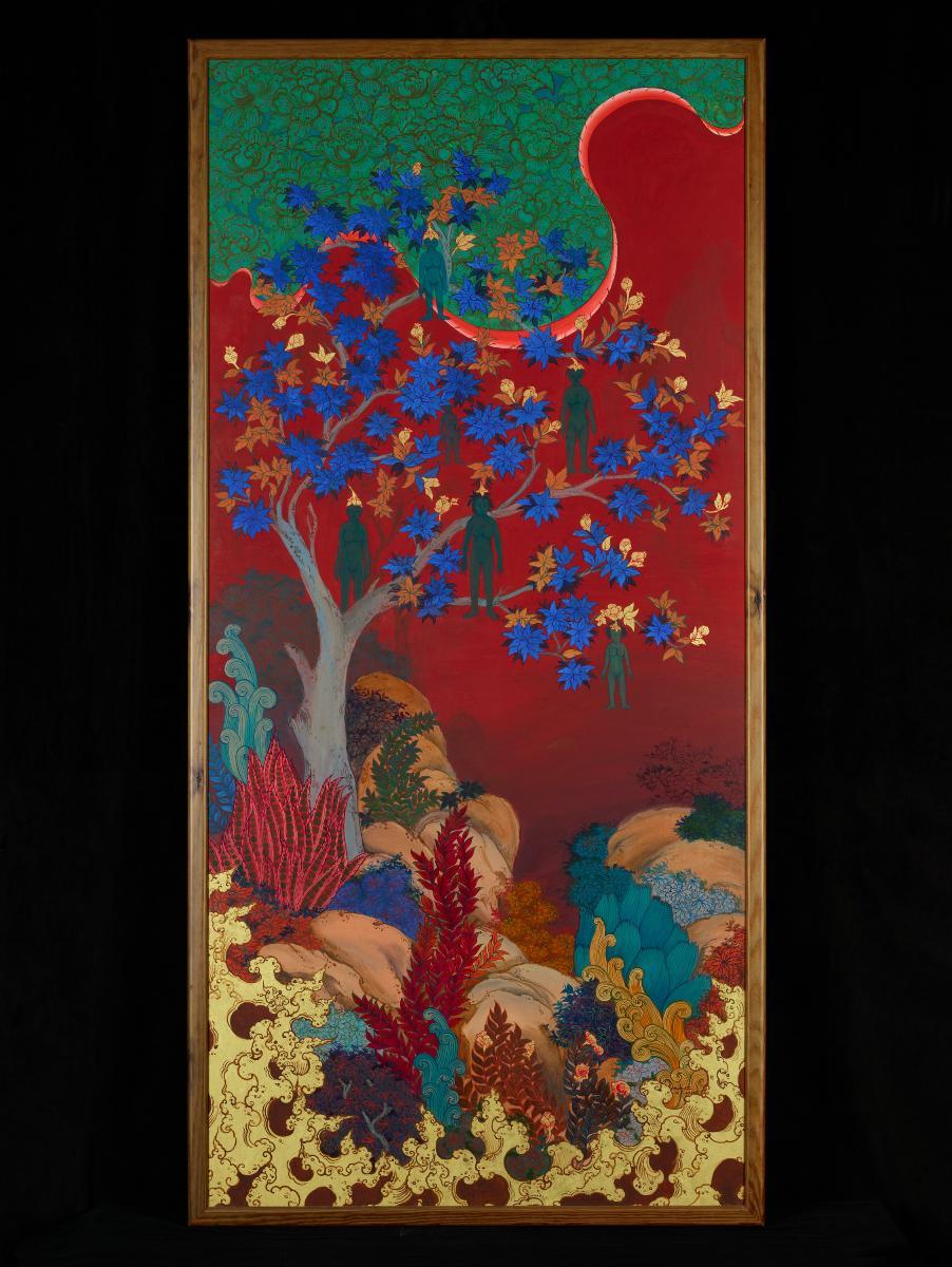 While working on the temple murals with the Tan Kudt Group in Phayao in 1991, Phaptawan witnessed how a noodle-seller family sold their daughter for 3,000 baht to a brothel. The Nariphon series germinated after Phaptawan took a conscious turn toward describing social issues and concerns in her artistic practice from 1995 onward. Nariphon refers to sixteen-year-old girl fruits hanging in the mythical Himaphan Forest that lures some hermits who have yet attained divinity. This motif was started by Thai artists of the Rattanakosin period and later used as a lacquer motif on the doors of places such as the National Museum and Wat Pho of Bangkok.