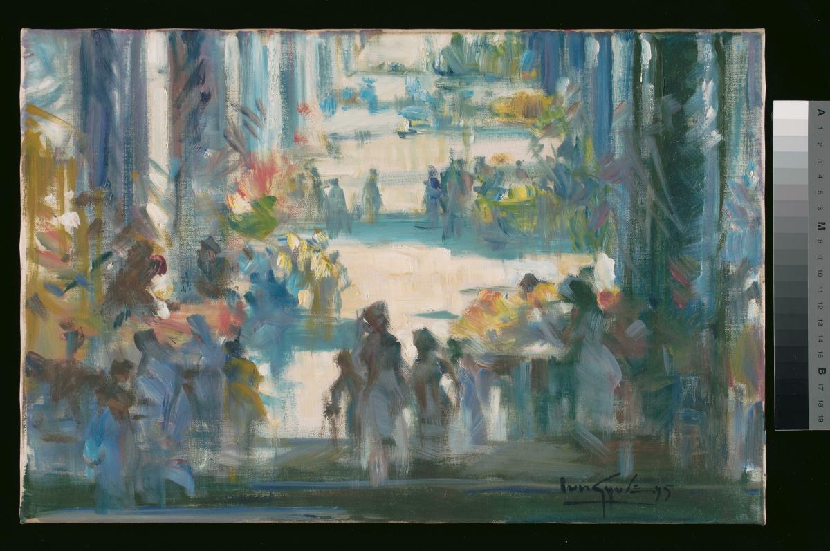 Maung Htun Hla (1874-1946), later known as M T Hla is known for his watercolours on paper depicting familiar landscapes of Burma and portraits of different ethnic types of Myanmar, then known as Burma. Sold primarily at the Smart and Mookerdum bookshop in Rangoon, these works were directed at a Western audience, keen to purchase souvenirs of their time in Myanmar. Works such as this represent the idyllic through the religious buildings, the untarnished landscape and the everyday life of people.
