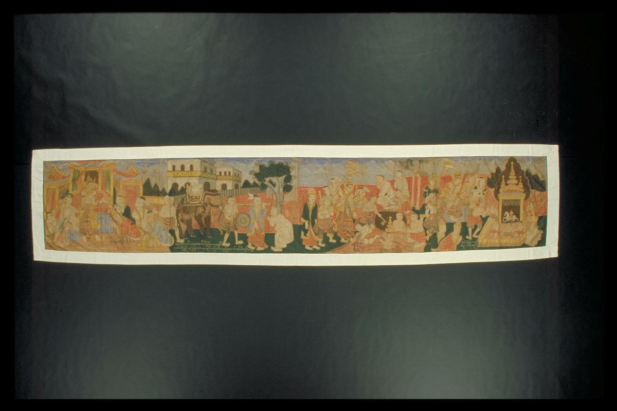 Maung Htun Hla (1874-1946), later known as M T Hla is known for his watercolours on paper depicting familiar landscapes of Burma and portraits of different ethnic types of Myanmar, then known as Burma. Sold primarily at the Smart and Mookerdum bookshop in Rangoon, these works were directed at a Western audience, keen to purchase souvenirs of their time in Myanmar. Works such as this represent the idyllic through the religious buildings, the untarnished landscape and the everyday life of people.