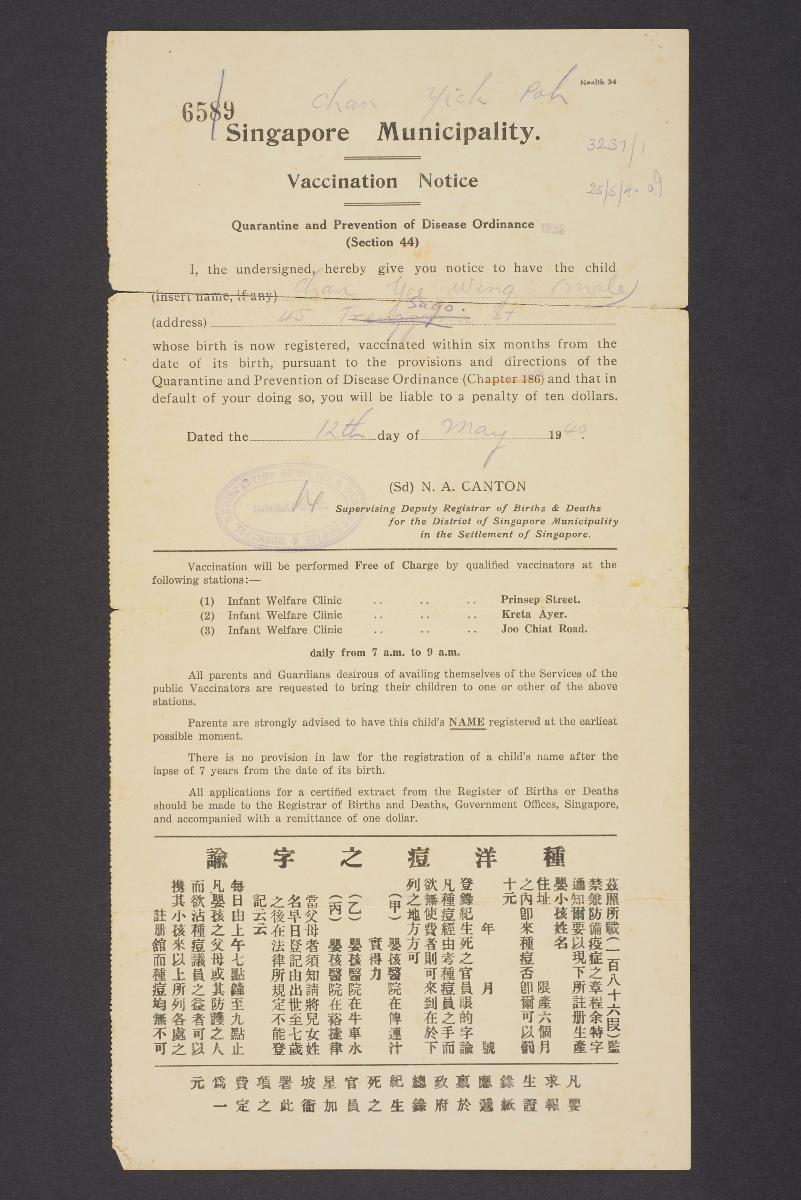 This is an instance of a notice detailing successful vaccination of an infant in the years immediately after Singapore's independence in 1965. It also doubles up as a checklist for health officers in recording whether an infant has gone through all the rounds of vaccinations. Infant vaccinations were issued in stages across a span of 18 months. The main diseases that require vaccination against are tubercolosis, diphteria and rubella.