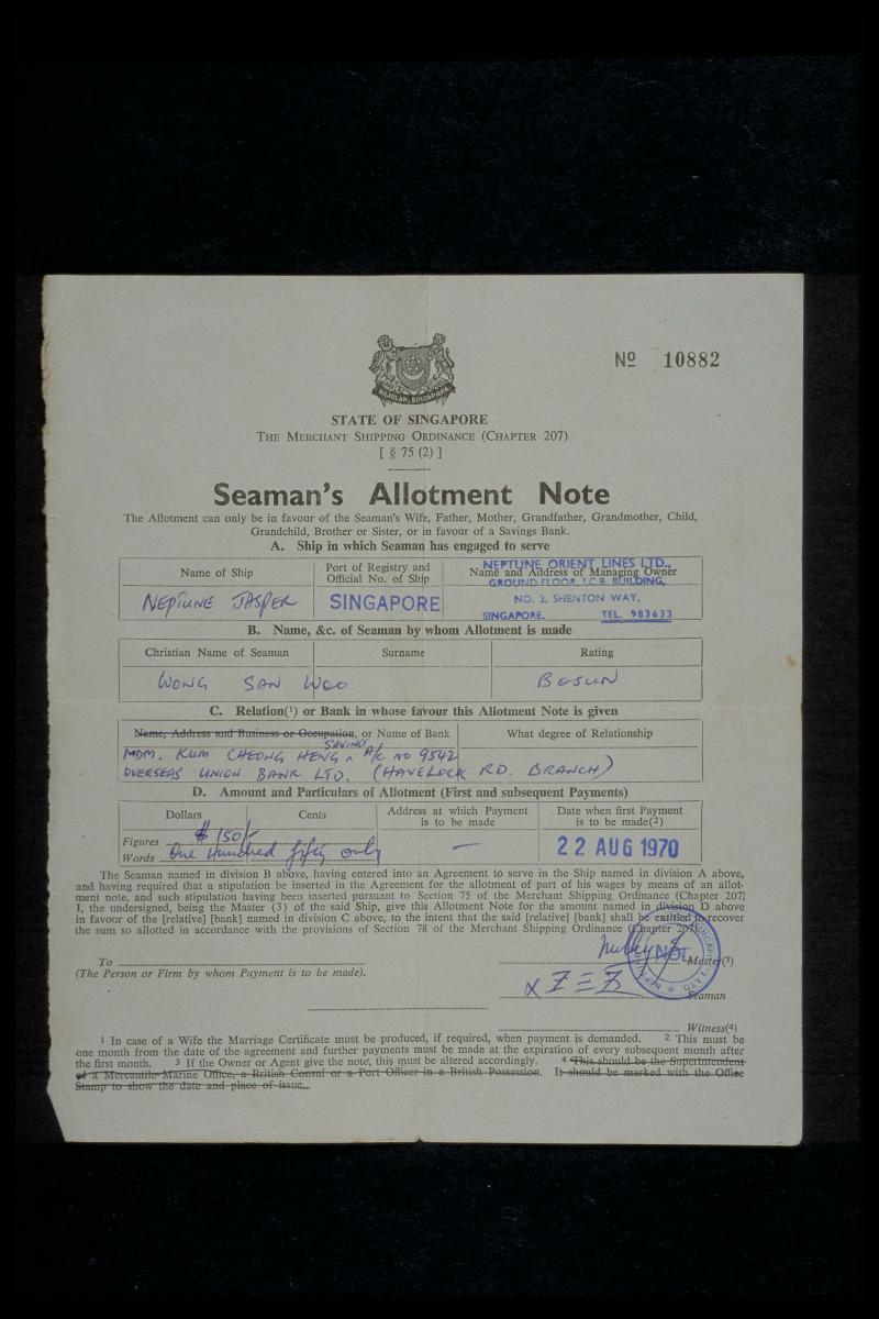 This document forms part of a group of shipping and personal identification documents which belonged to the late Asip bin Ali, dated 1948 to the 1970s. The documents paint a vivid picture of Asip bin Ali's career as a sailor, from the point of his appointment in 1948 (based on this Certificate of Service, but mentioned by his family as 1946) through to the late 1970s, whereupon he retired as quartermaster and crew supervisor (as illustrated by the Wages of Deck document). This allotment note was drafted and completed by sailors as a way of allocating their wages to a family member or loved one in the event of an unlikely accident at work, and had to be completed for every extended voyage.