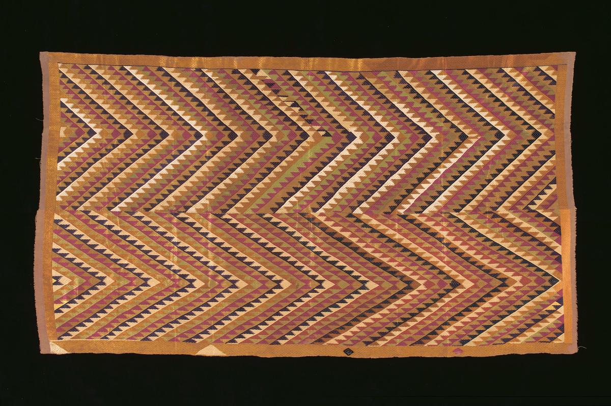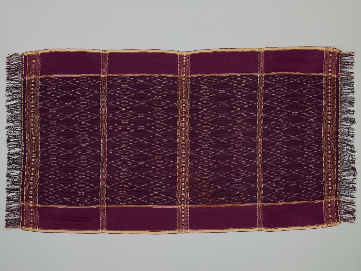 This wedding backdrop is made out of sequin pieces and consists of a main panel (dinding tengah) as well as two fringe panels (tabiran). It is known as kain arguci (also spelt as air guci), with 'arguci' being a reference to the style of embroidery whereby sequin pieces are embroidered to create large-scale decorative motifs upon a piece of silk or satin. Arguci is thought to have originated from the Banjar community in South Kalimantan, Indonesia in the eighteenth-century and is said to have derived from the custom amongst royalty and noblemen of wearing gold, silver and bronze accessories as well as various gemstones as part of their wedding attire. However, the practice of its use also extended to the Banjar community in Singapore, who recall purchasing or renting them from merchants in Singapore and in South Kalimantan. Arguci textiles were initially made with heavy and expensive brass sequin pieces but these were later replaced with plastic sequin pieces in the late-nineteenth and early-twentieth century from suppliers in Singapore, after it became a free port under the Dutch East Indies Company.