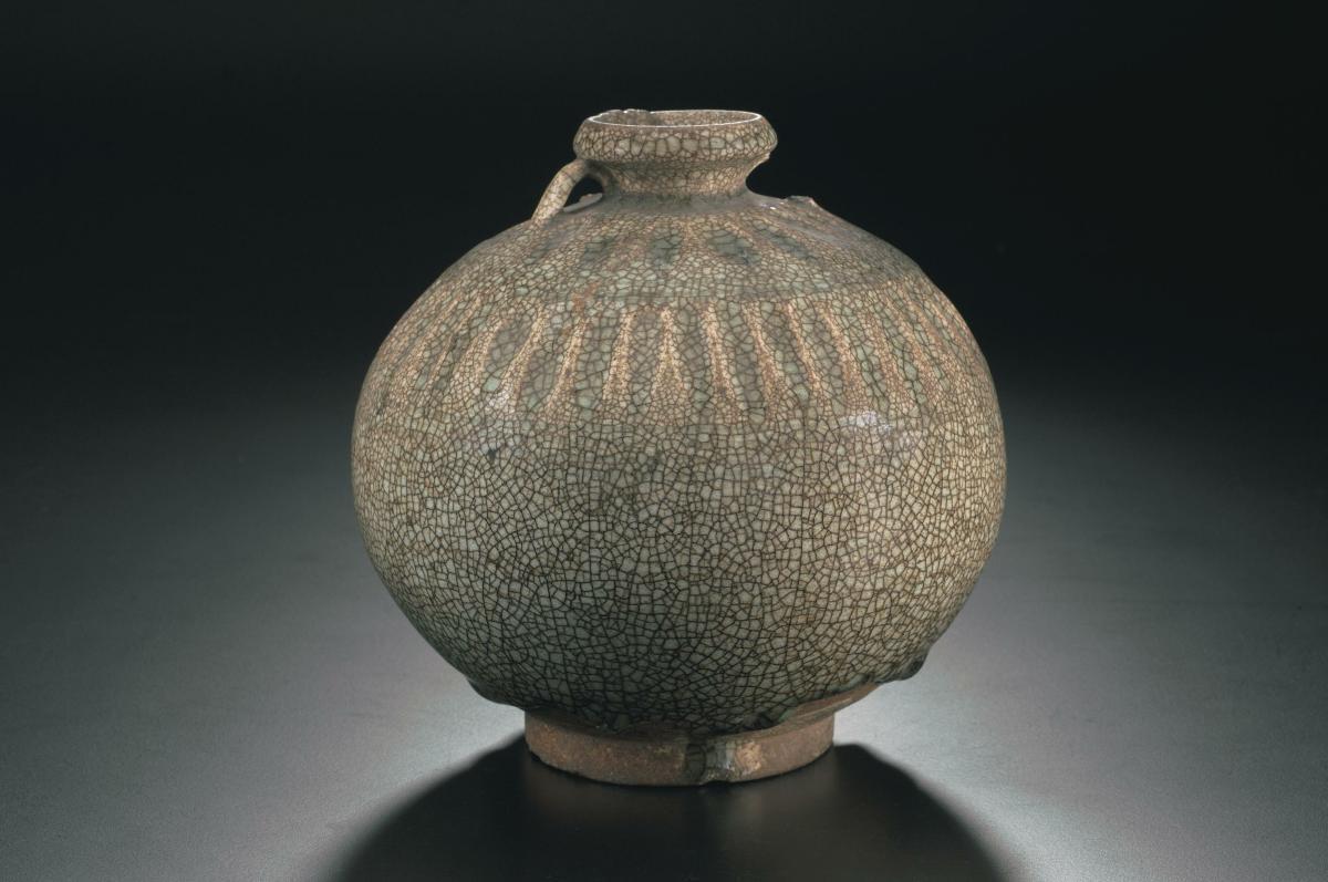 This large vase is covered in a sky-blue celadon finely crackled glaze reminiscent of Song dynasty guan or ge wares, and carved in shallow relief with rhythmic linear furrows that break up its monumentality. This is characteristic of the ceramic art of Nakajima Hiroshi (b. 1933), who was born in Takeo City, Saga Prefecture, and designated a Living National Treasure in 2007 for his achievements in seiji (celadon) innovation. The artist presented the vase in wrapping cloth and a signed wooden box to the late Minister-Mentor Lee Kuan Yew on 13 June 2014.