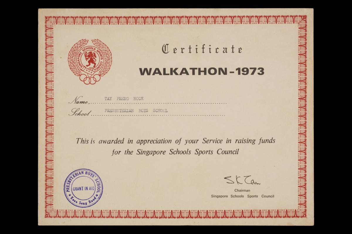 This graduation certificate carries Chinese Nationalist Party flag motifs. It was issued by the Happy School, a free public Chinese-medium school in Geylang. The establishment of the school in 1946 was initiated by the chairperson of the Happy World Dance Troupe, Madam He Yan, who were concerned with large number of idle children roaming the streets of Geylang when their education was interrupted by World War II.