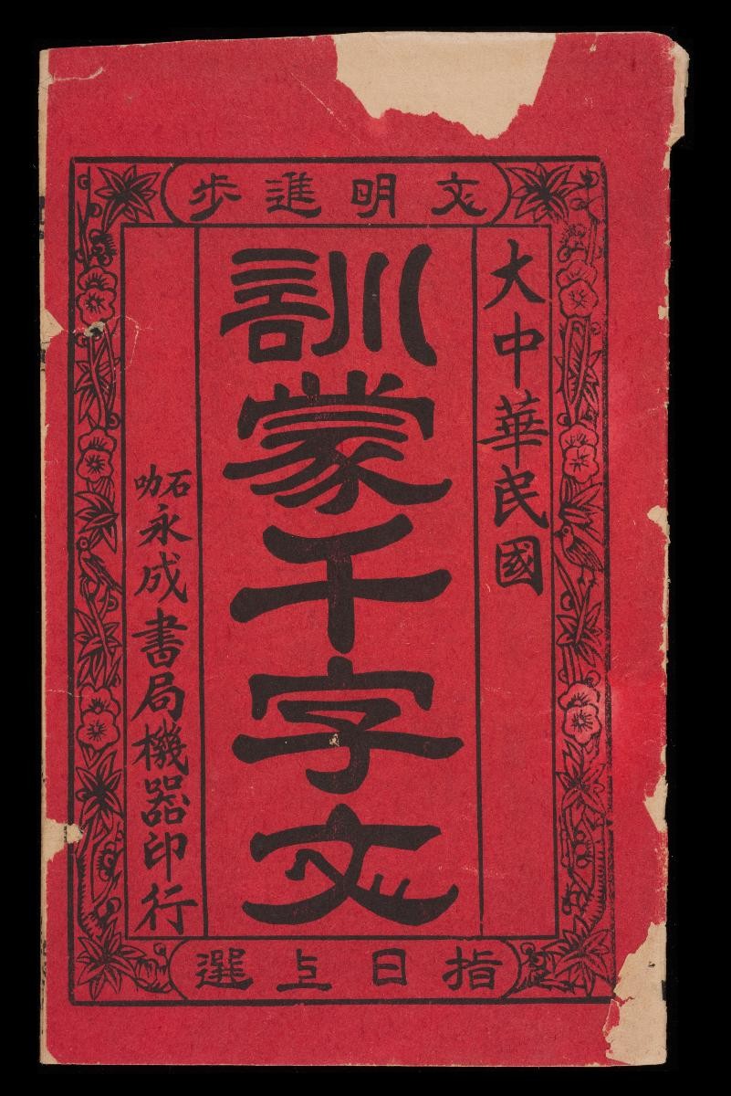 The Thousand Character Classic has been used as a primer for teaching Chinese characters to children since the Liang dynasty in the sixth century. It contains exactly one thousand characters, arranged into 250 lines of four-character phrases. It is also grouped into rhyming stanzas to make it easy to memorise. This version also incorporates the Hundred Families’ Surnames, another classic used in Meng Xue (early learning), on a small row on top of the pages of this book.Published in Xiamen, Fujian, the cover of this book features the common nianhua (“lunar new year prints”) motif of Tian Guan (天官) with children. The publisher cleverly incorporated the name of its publishing house and location onto the scrolls, which usually holds auspicious sayings. Such books were used in Singapore to teach young children basic Chinese characters.