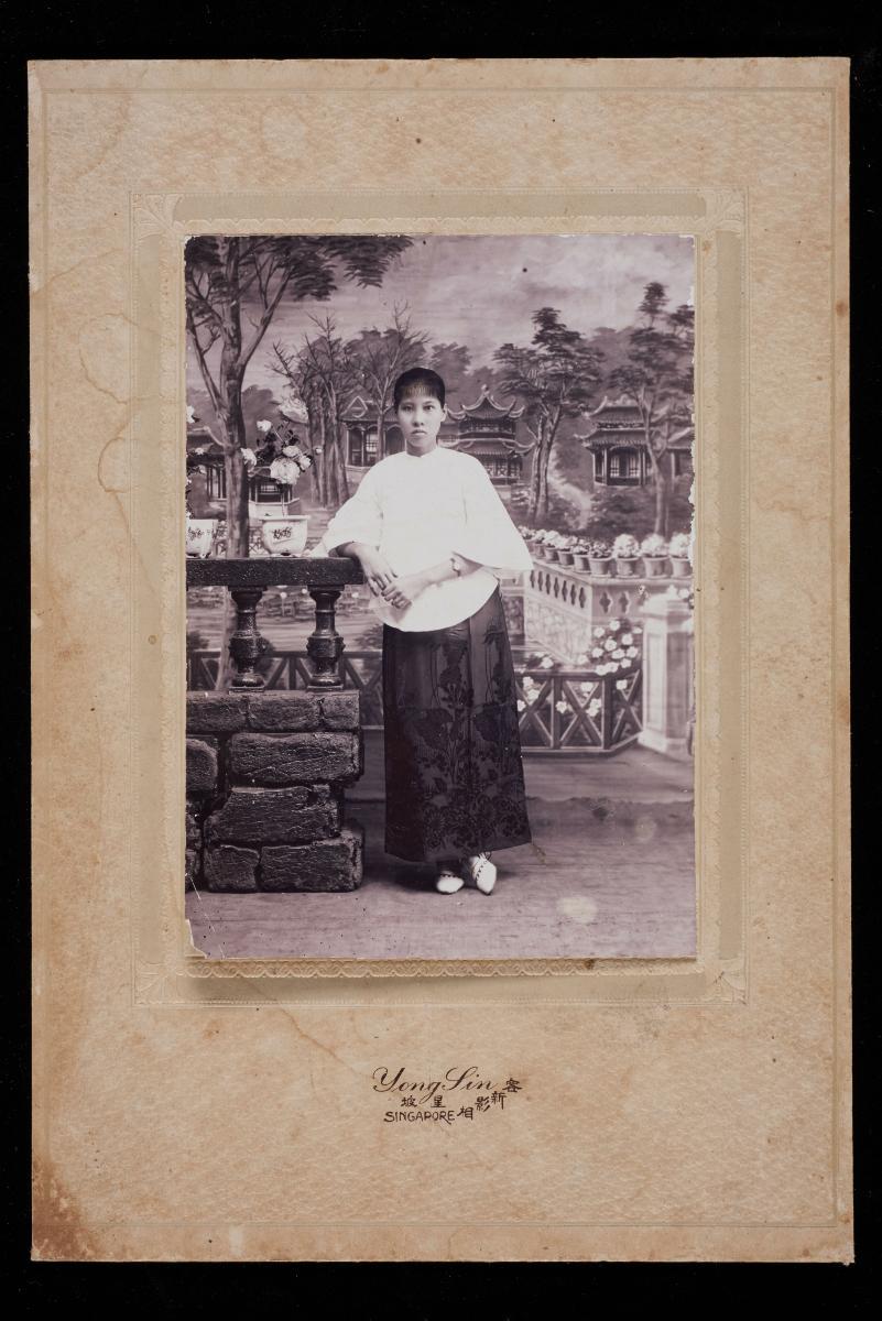 This studio portrait of a young Chinese woman was taken by Canton Studio in Singapore. The backdrop features a house and garden, while the woman is holding on to a faux wooden fence.