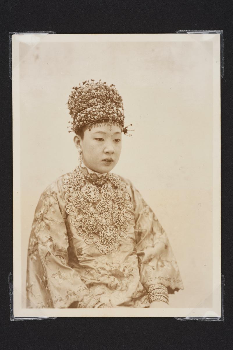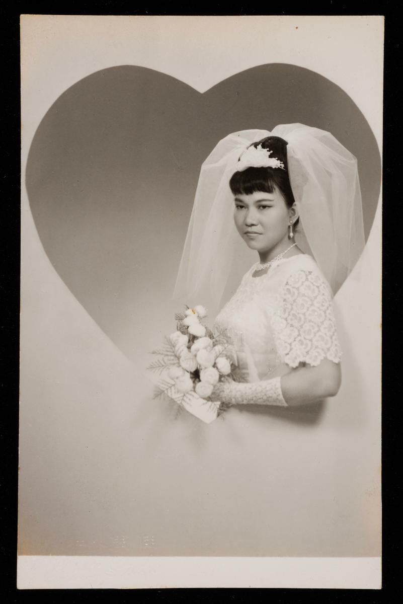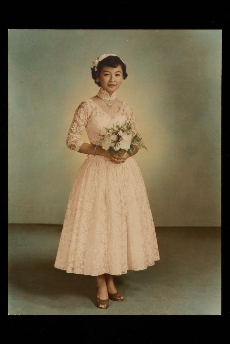 This studio portrait of a bridal party comprising the bride in a white flounced dress, the groom in a suit, a best man in suit, and four bridesmaids in two pairs of matching dresses, was taken by Mellow Studio in Singapore. The photographic studio was active by 1958 when it had a branch at the Great World, and in the 1970s while operating at Tanjong Pagar.