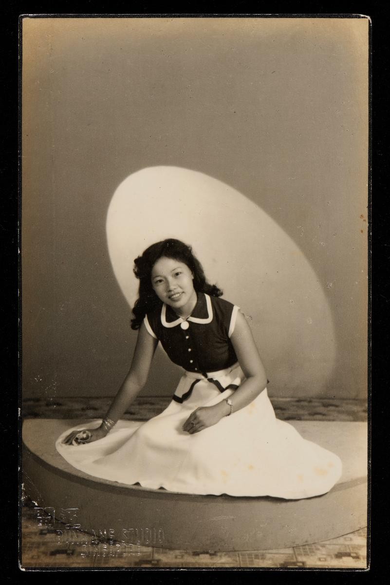 This studio portrait of a pair of Chinese woman seated on white painted geometric chairs was taken by Lye Ying Studio located at Great World in Singapore.