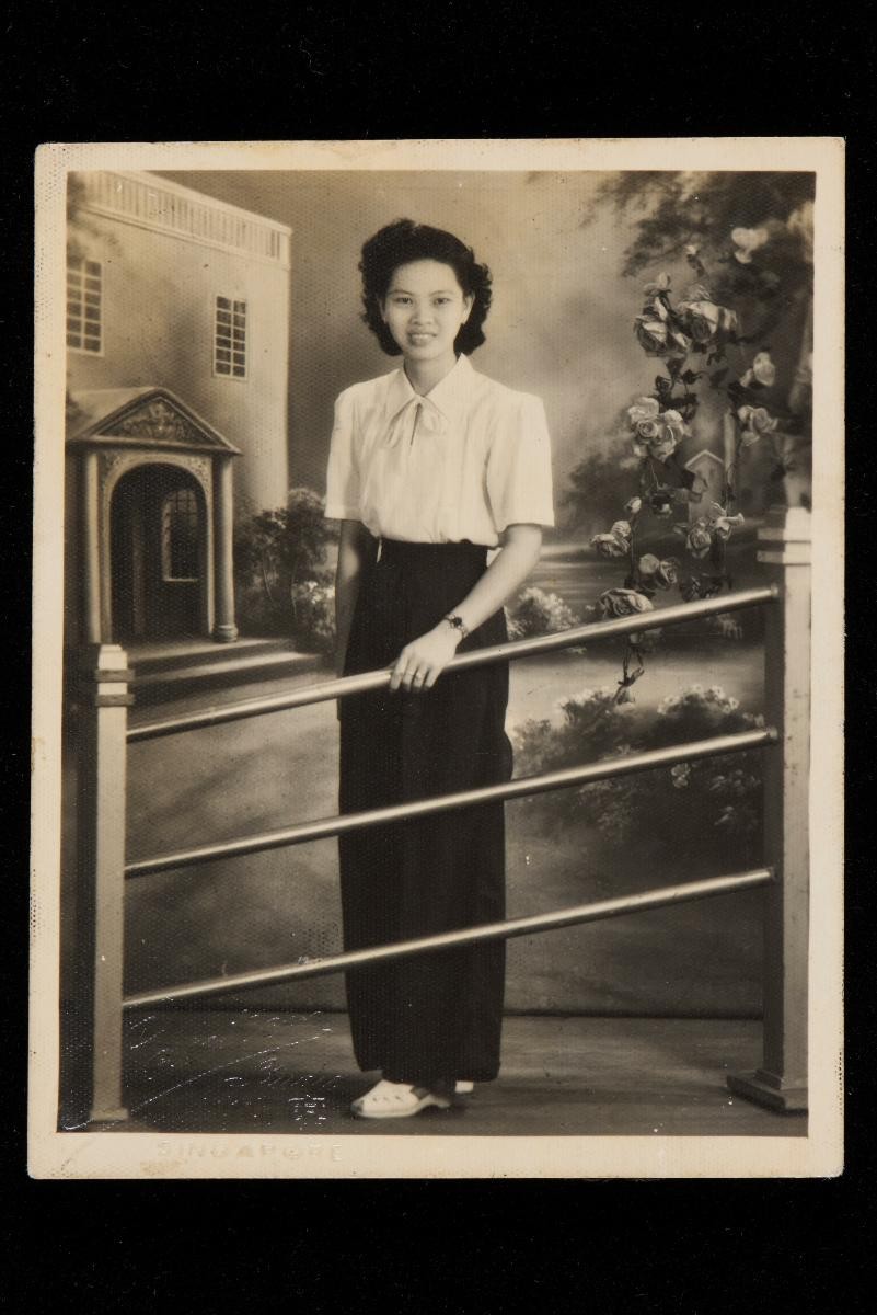 This studio portrait of a Chinese girl holding on to a bamboo support was taken at the Happy World branch of Beauty Studio, a photographic studio in Singapore.