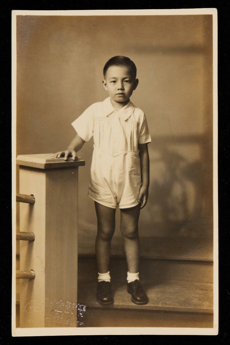 This studio portrait of a young Chinese boy and girl posing by a metal railing was taken in A1 Studio in Singapore.