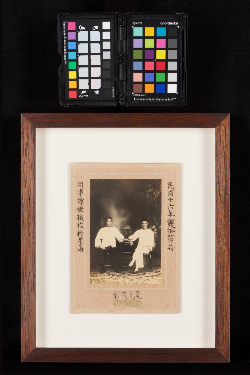 This studio portrait of a pair of young Chinese women in matching floral outfits was taken at Yuet Kong Studio, located at the Great World, one of the three main amusement parks built in Singapore before WWII.