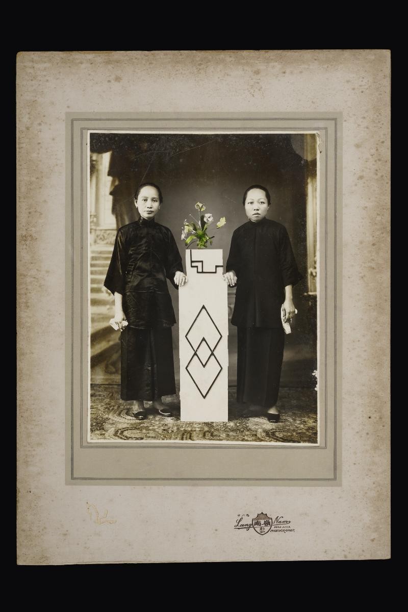 This studio portrait of a pair of young Chinese women in matching floral outfits was taken at Happy Studio, located at Happy World, one of the three main amusement parks built in Singapore before WWII.