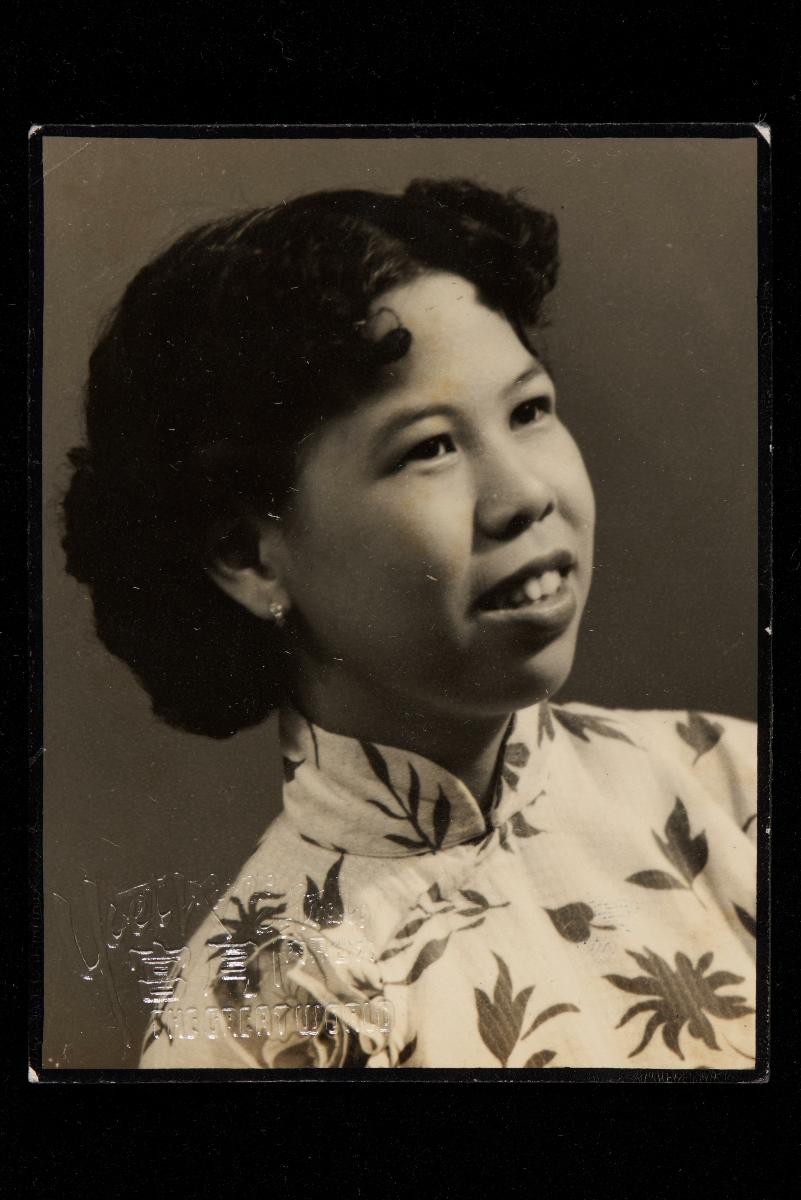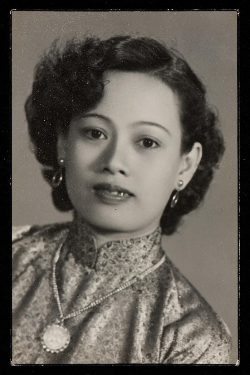 This studio portrait of three young Chinese women wearing matching cheongsams with bold floral patterns was taken at De Lux Studio, located on 33 Stamford Road near Capitol Theatre and active in the 1940s and 1950s.